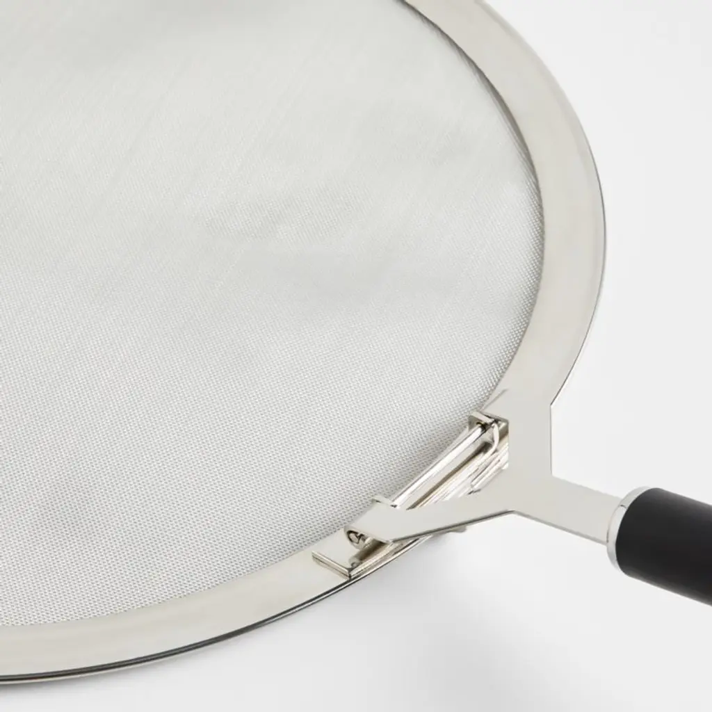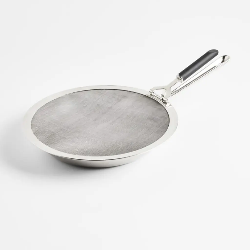 Protecting your stove, countertops and yourself from splattering grease with our signature splatter guard. The handle locks into place during use then folds away for compact storage. Stainless steel shapes a sleek utensil fitted with a black soft-touch handle for a sturdy, comfortable grip. We love the way the refined beveled edge finishes the handle with a dynamic detail. Our exclusive Crate & Barrel soft-touch tools make for a well-outfitted workspace that's up to any cooking challenge.Direct from our design team to your kitchen, the sophisticated assortment in our signature The Kitchen by Crate line combines beautiful simplicity and peerless performance. From initial sketches to rigorous testing, every expertly designed product in this kitchen collection meets our standards, and yours.View all "The Kitchen by Crate" collection