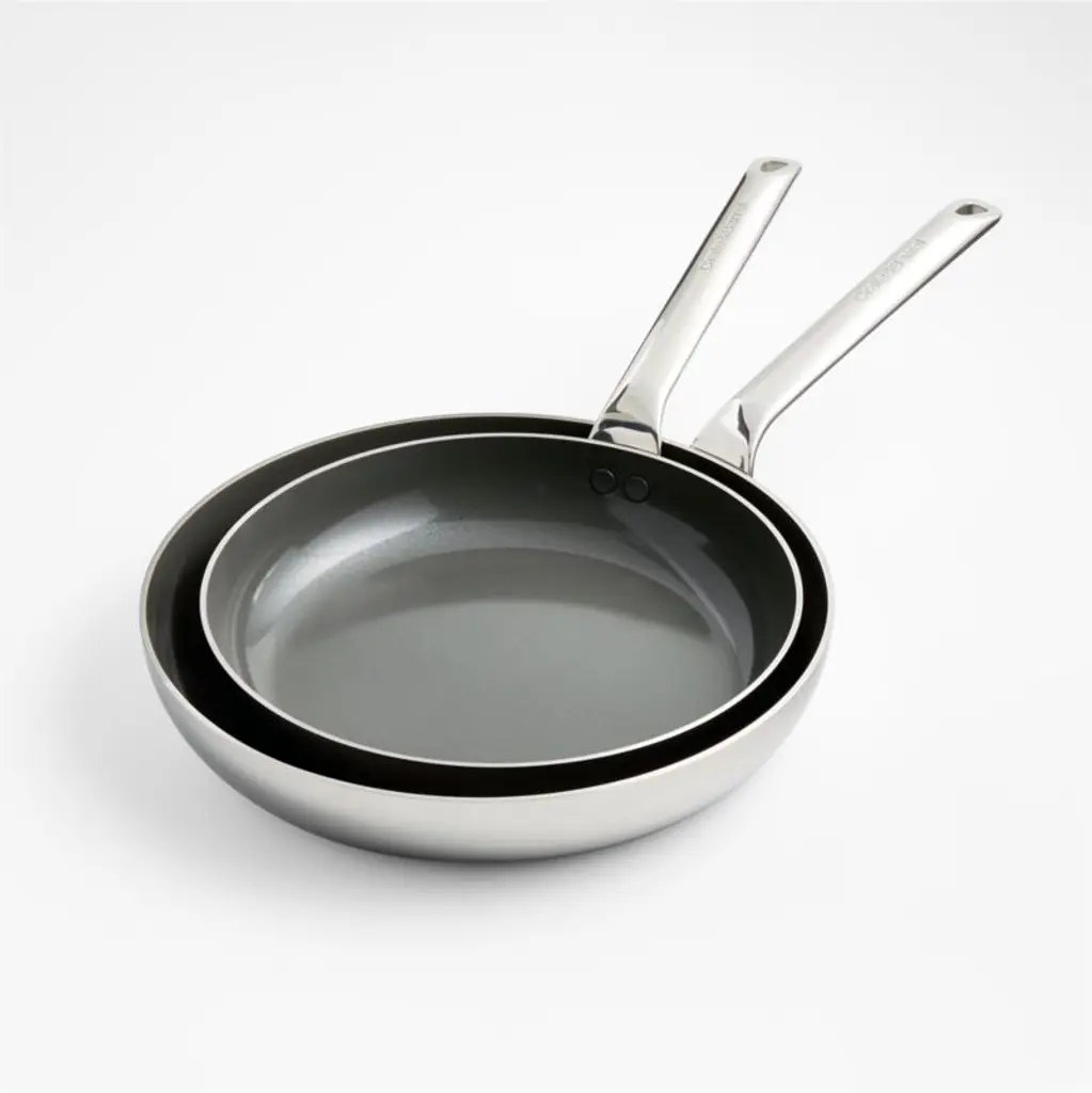 Our exclusive cookware collection has been reviewed at every stage to bring you the heirloom quality and refined look your kitchen deserves. The skillets' five-ply construction wraps the copper EvenCook Cores in layers of aluminum and stainless steel for precision heat control and professional results. The diamond-infused ceramic coating provides a non-stick cooking surface that ensures effortless food release and easy cleanup. The ergonomically considered handles stamped with the Crate & Barrel logo feel comfortable and balanced and are secured with smooth-profile rivets for easy cleaning. The set includes 10- and 12-inch frying pans that are ideal for browning and searing.Direct from our design team to your kitchen, the sophisticated assortment in our signature The Kitchen by Crate line combines beautiful simplicity and peerless performance. From initial sketches to rigorous testing, every expertly designed product in this kitchen collection meets our standards, and yours.View all "The Kitchen by Crate" collection