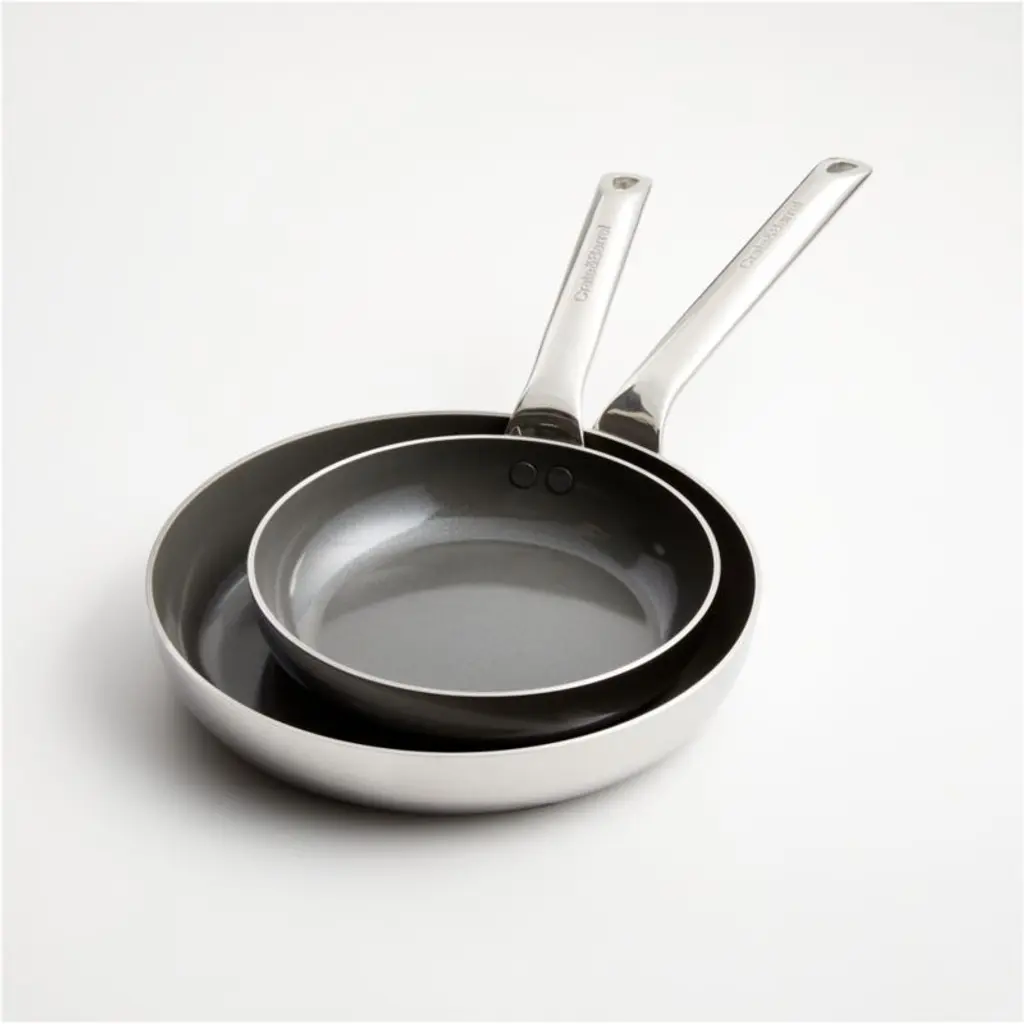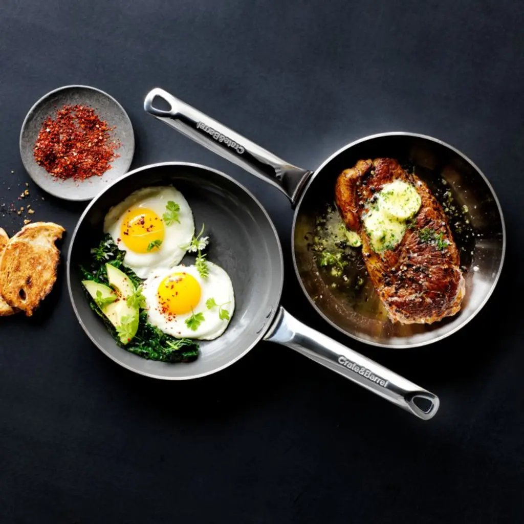Our exclusive cookware collection has been reviewed at every stage to bring you the heirloom quality and refined look your kitchen deserves. The skillets' five-ply construction wraps the copper EvenCook Core® in layers of aluminum and stainless steel for precision heat control and professional results. The diamond-infused ceramic coating provides a non-stick cooking surface that ensures effortless food release and easy cleanup. The ergonomically considered handles stamped with the Crate & Barrel logo feel comfortable and balanced and are secured with smooth-profile rivets for easy cleaning. The set includes 8- and 10-inch frying pans that are ideal for browning and searing.Direct from our design team to your kitchen, the sophisticated assortment in our signature The Kitchen by Crate line combines beautiful simplicity and peerless performance. From initial sketches to rigorous testing, every expertly designed product in this kitchen collection meets our standards, and yours.View all "The Kitchen by Crate" collection