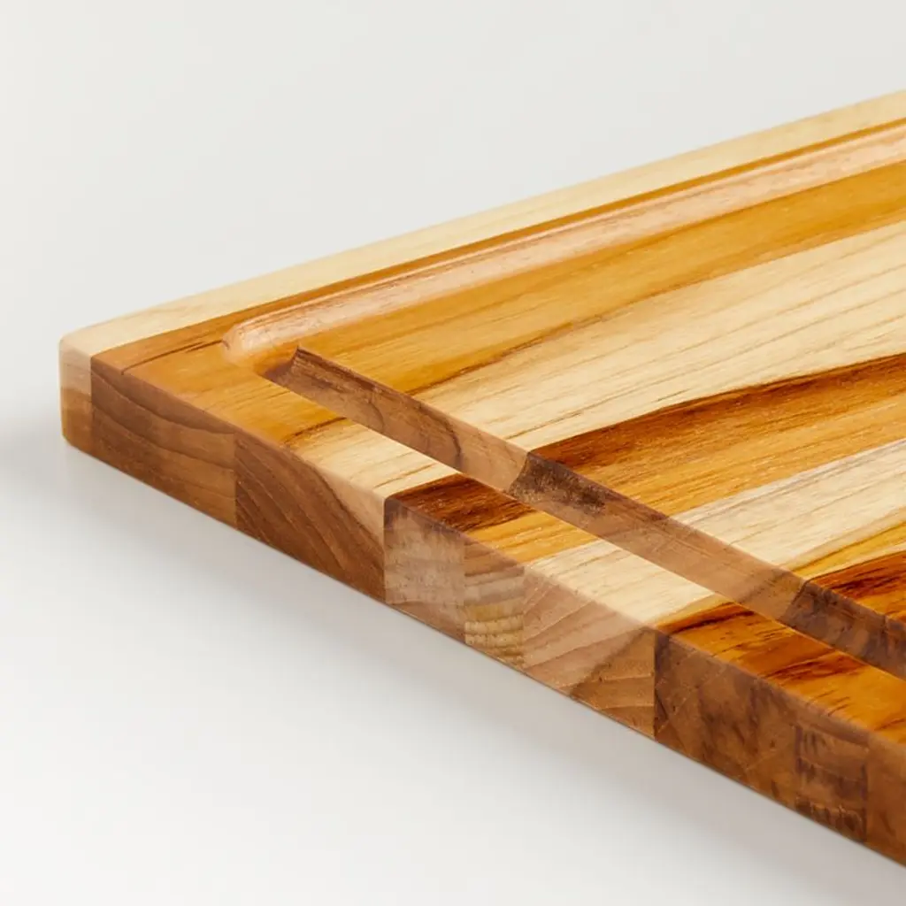 The intentionally simple designs of our signature Crate & Barrel cutting boards keep all the attention on the beauty of wood. Lengths of teak subtly stripe this edge-grain board in contrasting tones. Use the grooved side to collect juices and crumbs as you cut, or flip the board over to serve cheese, charcuterie or appetizers. Modern yet timeless, our teak edge-grain cutting board offers versatility, classic good looks and a natural durability that stands up easily to everyday use.Direct from our design team to your kitchen, the sophisticated assortment in our signature The Kitchen by Crate line combines beautiful simplicity and peerless performance. From initial sketches to rigorous testing, every expertly designed product in this kitchen collection meets our standards, and yours.By choosing FSC ®-certified cutting boards, you are supporting responsible management of the world's forests.View all "The Kitchen by Crate" collection