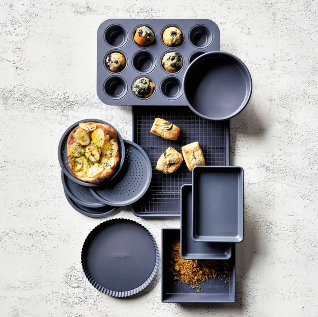 Super durable, lighter than cast iron and oh, that gorgeous unexpected blue. Perfect for toasting nuts, reheating leftovers and baking a couple of cookies, our slate blue eighth sheet pans are part of our exclusive bakeware collection that takes its cue from professional kitchens. Made of carbon steelan alloy of 99% iron and 1% carbon that's nearly indestructiblethe two pans heat quickly and maintain consistent temperatures for perfectly browned and crisped foods. The reinforced rims prevent warping, and a double layer of silicone-based non-stick coating ensures easy release and quick cleanup.