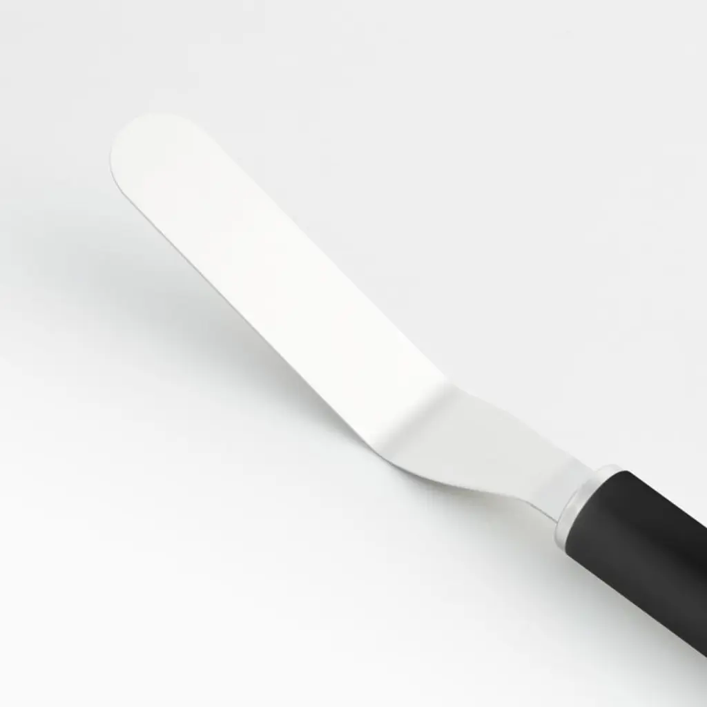 Spread and smooth buttercream, ganache, jam and meringue with our small offset icing spatula. Mirror-polished stainless steel shapes the sleek cake-decorating blade, while the soft-touch handle with a refined beveled edge provides a sturdy, comfortable grip. Combine with the other pastry tools in our exclusive Crate & Barrel collection for a well-outfitted workspace that's up to any baking challenge.Direct from our design team to your kitchen, the sophisticated assortment in our signature The Kitchen by Crate line combines beautiful simplicity and peerless performance. From initial sketches to rigorous testing, every expertly designed product in this kitchen collection meets our standards, and yours.View all "The Kitchen by Crate" collection