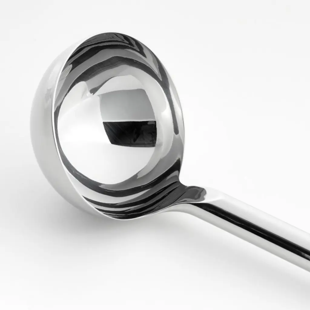 Scoop and serve soups, stews and sauces with our signature stainless steel ladle. The sturdy utensil ably handles the thickest chili, bisque or bolognese. Polished stainless steel shapes a sleek ladle with a cylindrical handle for a sturdy grip and a professional look. We love the way the refined beveled edge finishes the elongated handle with a dynamic detail. Combine the dishwasher-safe ladle with the other exquisitely proportioned utensils in our exclusive Crate & Barrel collection for a well-outfitted workspace that's up to any cooking challenge.View all "The Kitchen by Crate" collection