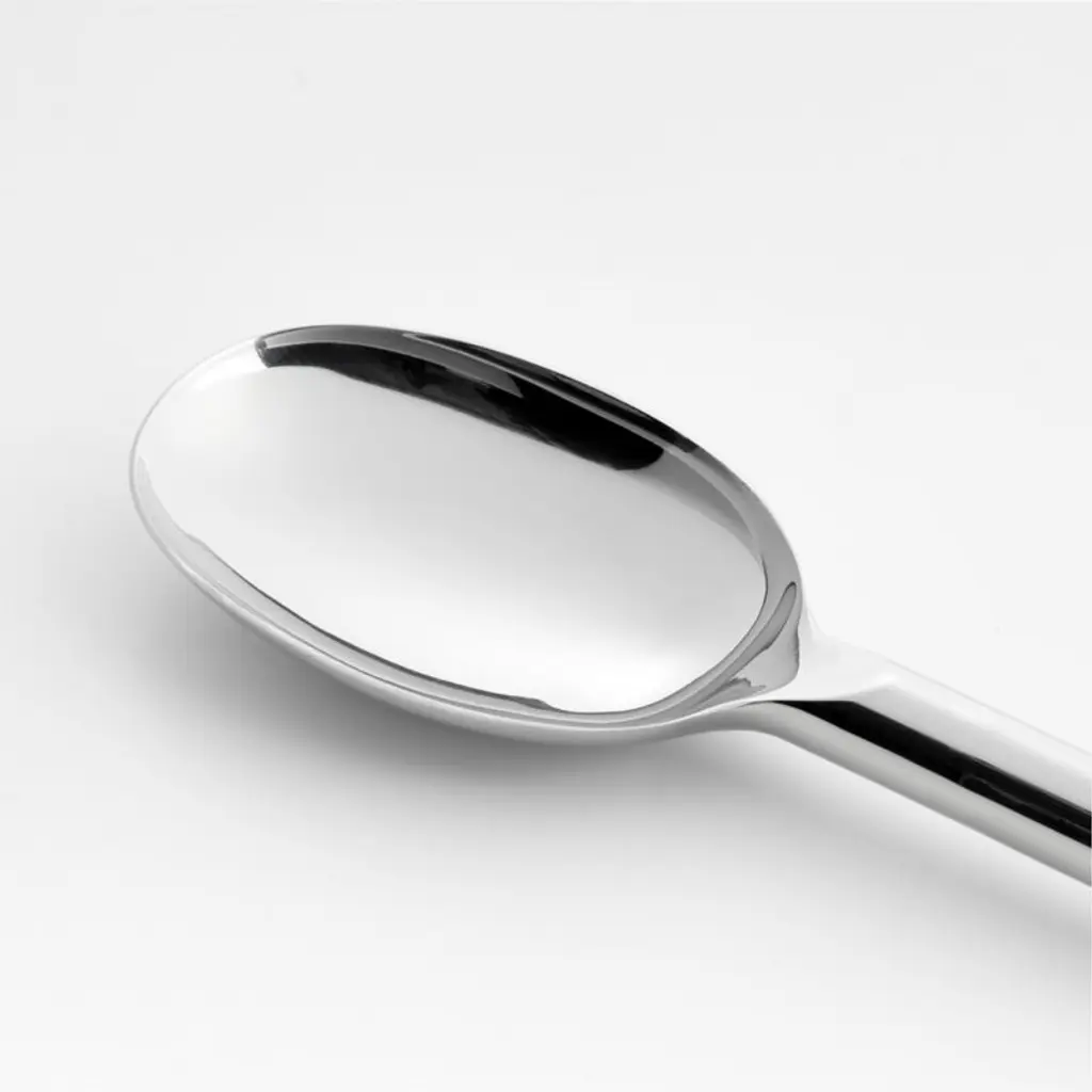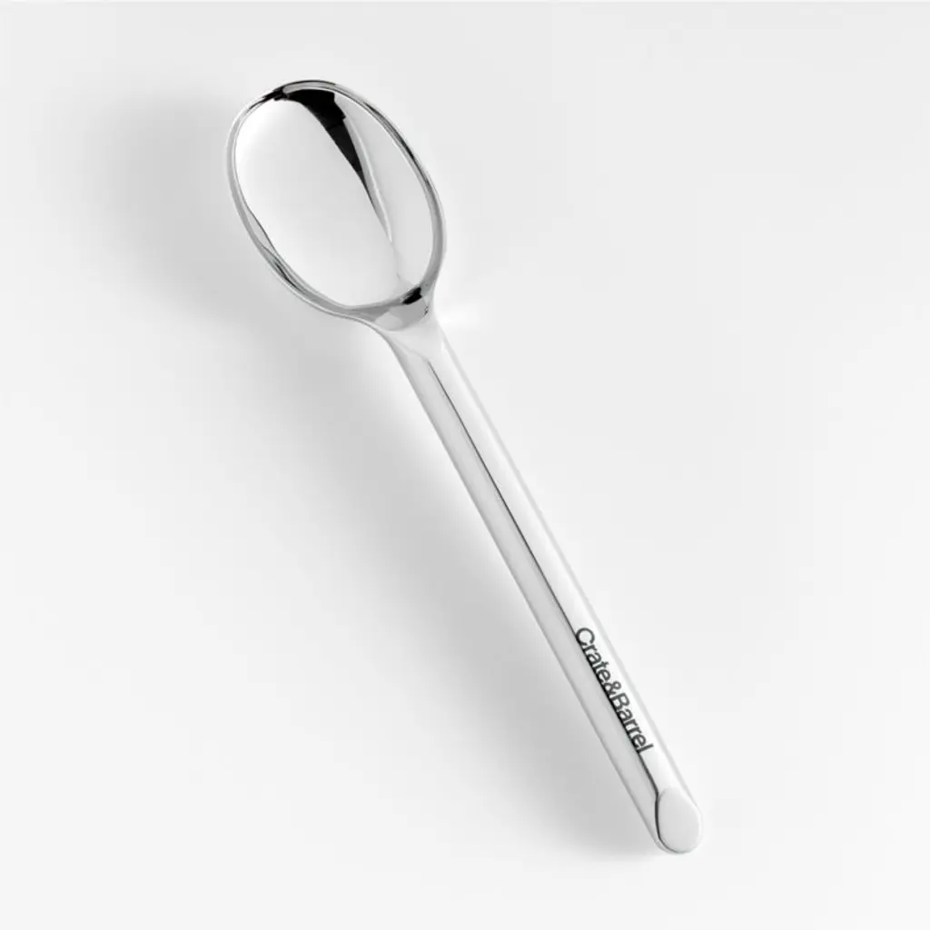 Stir, scoop and serve with our signature stainless steel spoon. The sturdy utensil ably stirs the thickest sauces, doughs and battersor folds the most delicate meringues. Polished stainless steel shapes a sleek spoon with a cylindrical handle for a sturdy grip and a professional look. We love the way the refined beveled edge finishes the elongated handle with a dynamic detail. Combine the dishwasher-safe spoon with the other exquisitely proportioned utensils in our exclusive Crate & Barrel collection for a well-outfitted workspace that's up to any cooking challenge.View all "The Kitchen by Crate" collection