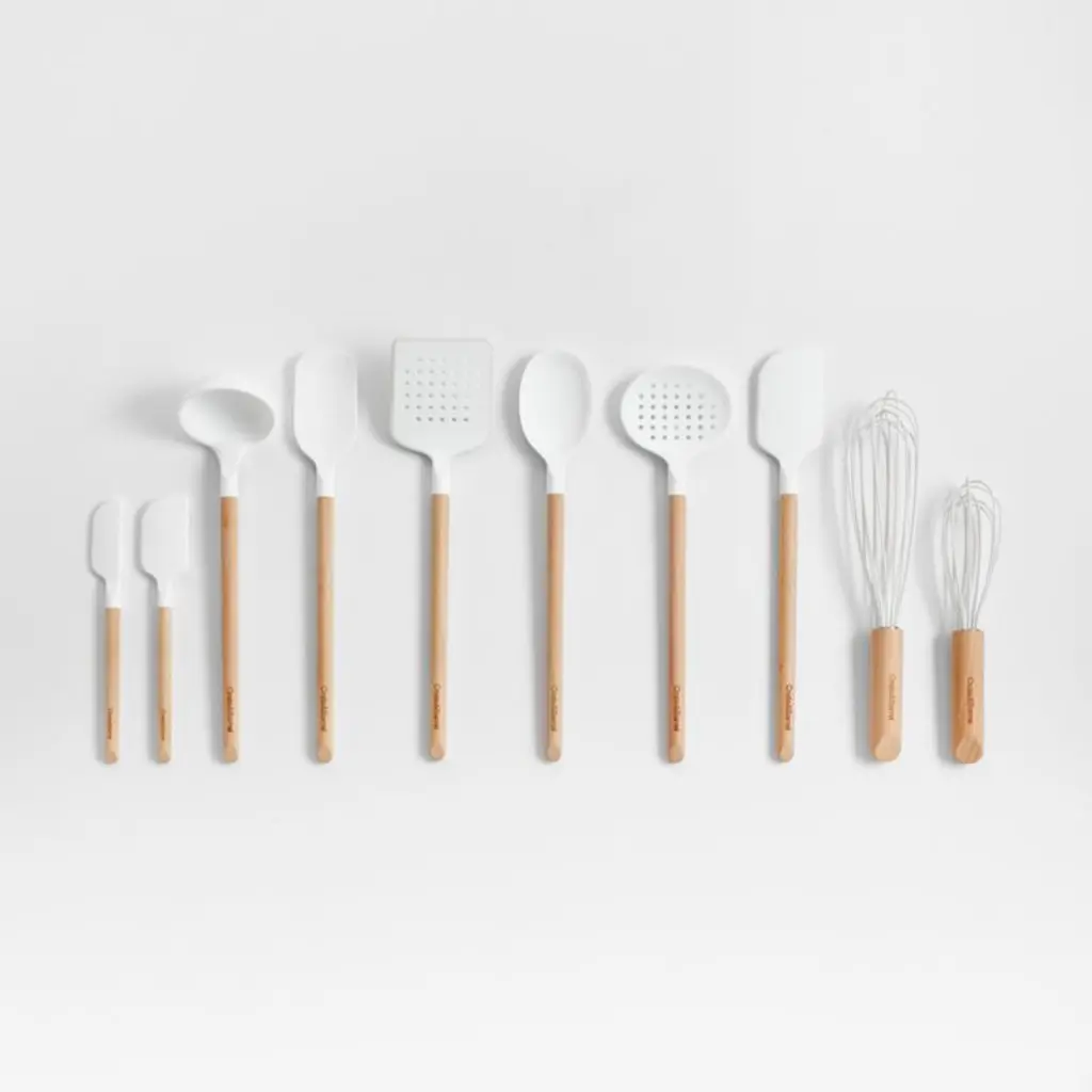 Stir, scoop, serve, flip and mix with our signature white silicone and wood utensils. Constructed with nylon cores for strength, the white silicone heads ably spread the thickest batters, flip and serve the heartiest potato pancakes or fold the most delicate meringues. Their flexible, tapered edges and soft-touch silicone won't damage non-stick cookware and resists stains, scratches and heat up to 600 degrees. Natural beechwood shapes cylindrical handles for a sturdy grip and a warm, classic look. We love the way the refined beveled edges finish the elongated handles with a dynamic detail. Create your own collection of Crate & Barrel utensils for a well-outfitted workspace that's up to any cooking challenge. Set includes: slotted spoon and turner, spoon, spatula, spoonula, ladle, 8" and 12" whisks and mini spatula.By choosing FSC ®-certified utensils, you are supporting responsible management of the world's forests.View all "The Kitchen by Crate" collection