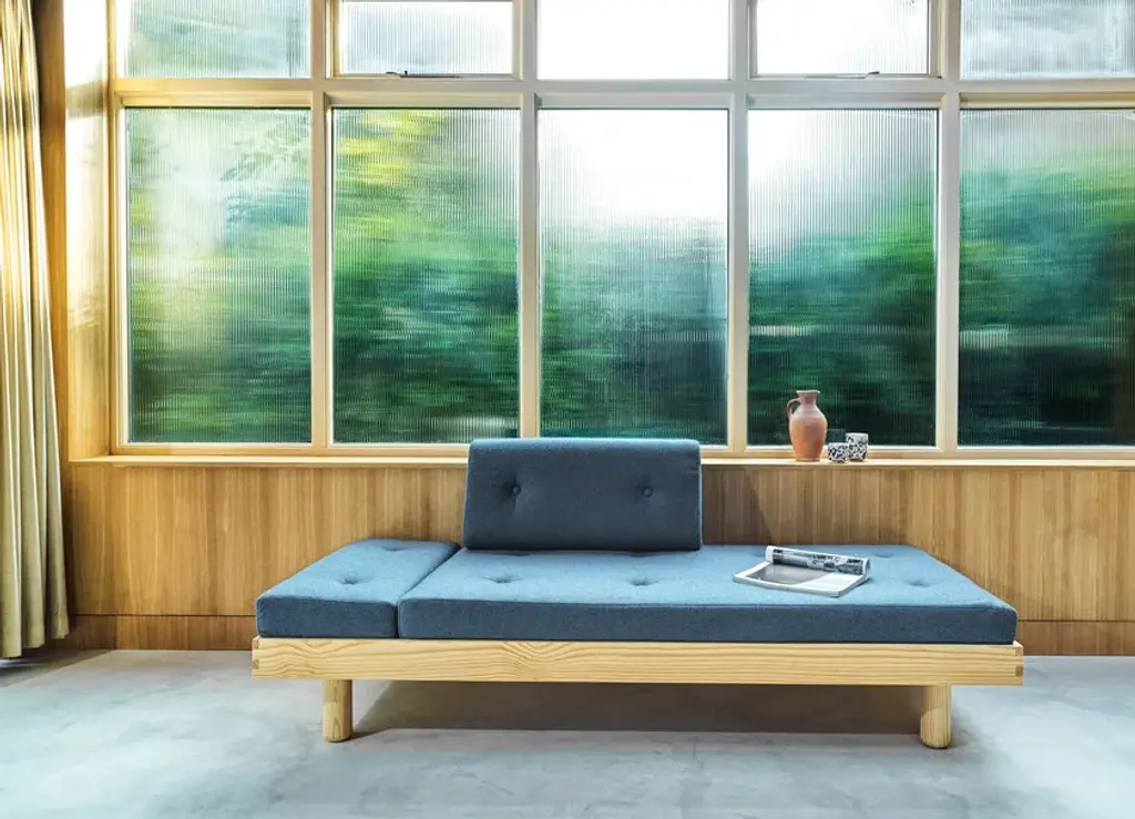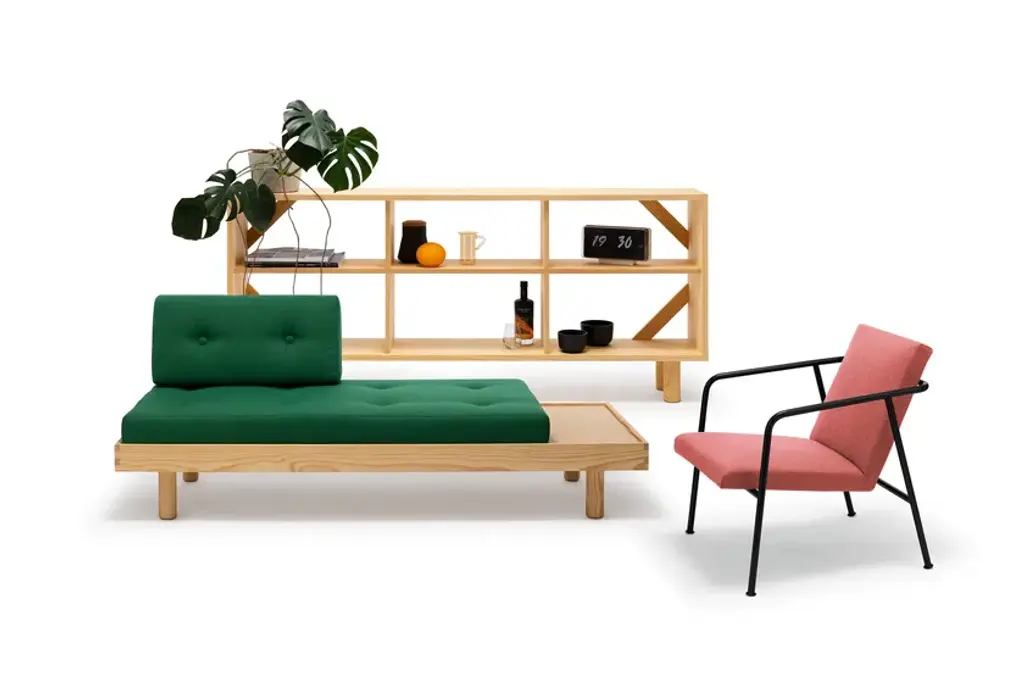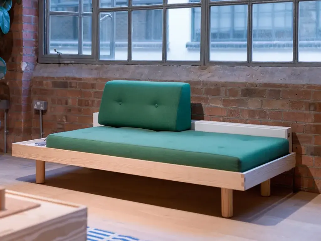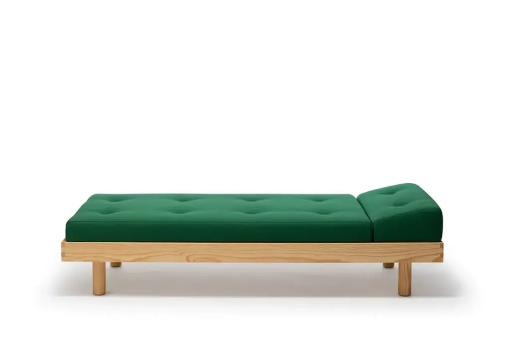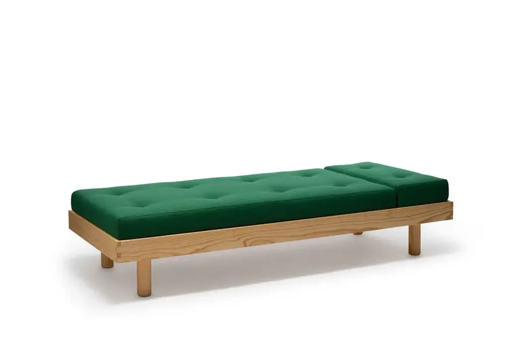 Crate is an upholstered chaise longue with a solid yellow pine frame.Materials:Waxed solid yellow pine, waxed veneered yellow pine, felt feet pads, foam and fabric cushion and mattress.