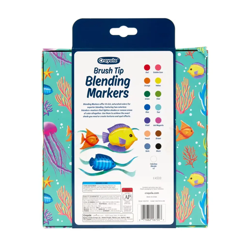 Experience the joy of creativity with the Crayola 16ct Blending Markers. These artist markers are designed with a flexible brush tip for brushstroke control, allowing you to create seamless blends and precise lines. The set includes 14 vibrant markers and two colorless blenders that can lighten shades or remove areas of color altogether, enabling you to achieve the exact shade you need or create textures and spot effects. Perfect for journaling, artistic creations, and adult coloring, these blendable, water-based markers allow for easy blending with other water-based mediums. Ideal for teens and adults, these markers inspire creative art projects and bring your imagination to life. The set comes in a reusable decorative storage box, making it a perfect gift for birthdays, Hanukkah, Christmas, Easter, or any occasion. Safe and nontoxic, these markers are recommended for children aged 4 and up. They also make excellent teacher appreciation gifts, showing gratitude with a touch of creativity.