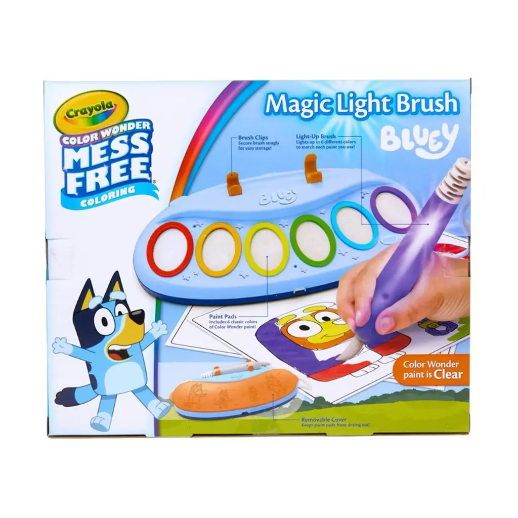 Experience the Magic of Painting with the Crayola Color Wonder Bluey Magic Light Brush! Transform painting into a magical experience with the Color Wonder Mess Free Bluey Magic Light Brush! This kids painting kit includes a paint palette featuring 6 vibrant colors and 18 sheets of Color Wonder Bluey Activity Pages, allowing kids to start creating their masterpieces right away. Though Color Wonder Paints are clear, the brush lights up to indicate the color, making it a creative and educational toddler learning toy. Designed for mess-free painting for toddlers, Color Wonder Paints only appear on special Color Wonder Paper, not on skin, clothing, or walls. This means kids can explore the joy of painting without any mess, making it perfect for preschool art supplies and toddler activities. Parents can let their little artists create without worry! The Color Wonder Bluey Paint Set is designed to prevent dry-up, ensuring kids can use it again and again. The paints are washable, making it an ideal Bluey gift for birthdays, Easter, Christmas, Hanukkah, or everyday gifting. Crayola adaptive art supplies and multi-sensory toys cater to kids and artists with diverse needs. From adaptive writing tools to tactile art play, creativity knows no bounds. Suitable for kids ages 3 and up. Whether you're looking for Bluey toys or Bluey arts and crafts ideas, this kids painting set is sure to delight and inspire hours of creative play.