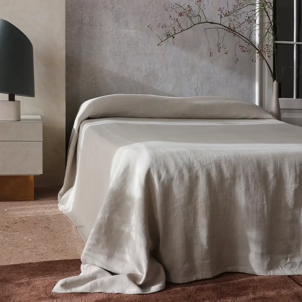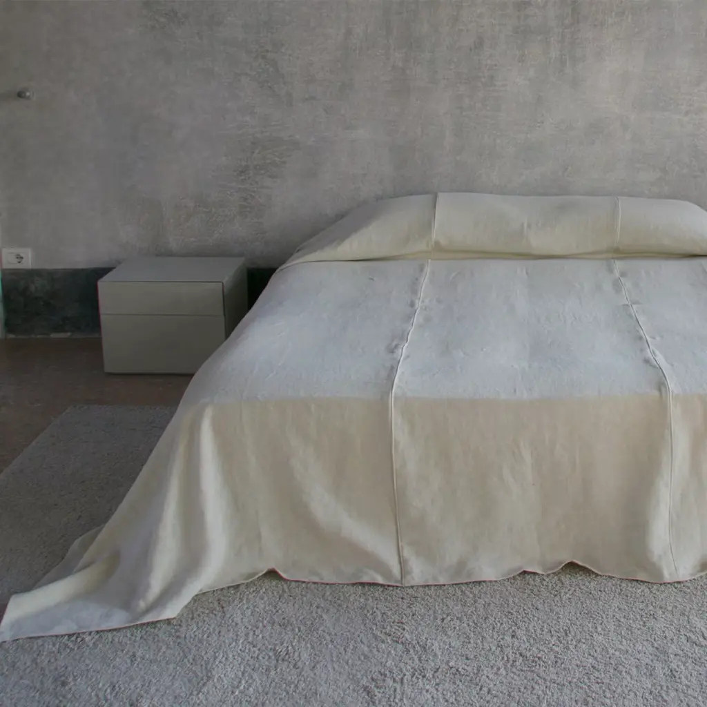 This cream heavy linen bed cover, featuring delicate piping, adds understated elegance to any bed. Its substantial weight provides warmth during cooler months and serves as a light cover in summer. Crafted from 100% handmade linen in Italy by traditional Venetian artisans, it’s available in various sizes. A versatile and refined addition to any bedroom, perfect for year-round use. For other details, please contact the concierge.