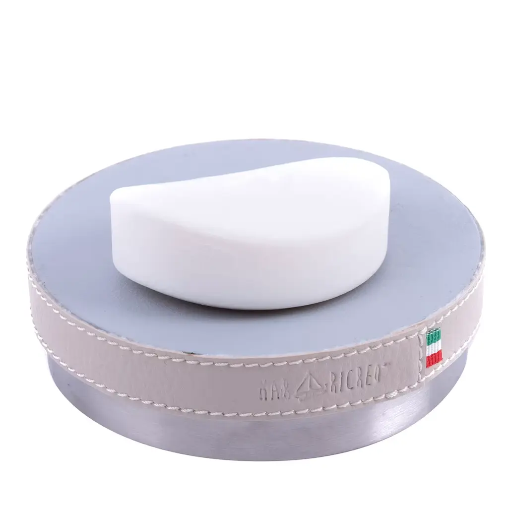 Boasting an elegant and clean round shape, this gorgeous soap holder will make a stunning addition to a contemporary-style bathroom decor. Handcrafted of steel and polystone, it is partly covered with cream-colored faux leather upholstery. Available in other colors upon choice, please contact the Concierge for further details and customizations.