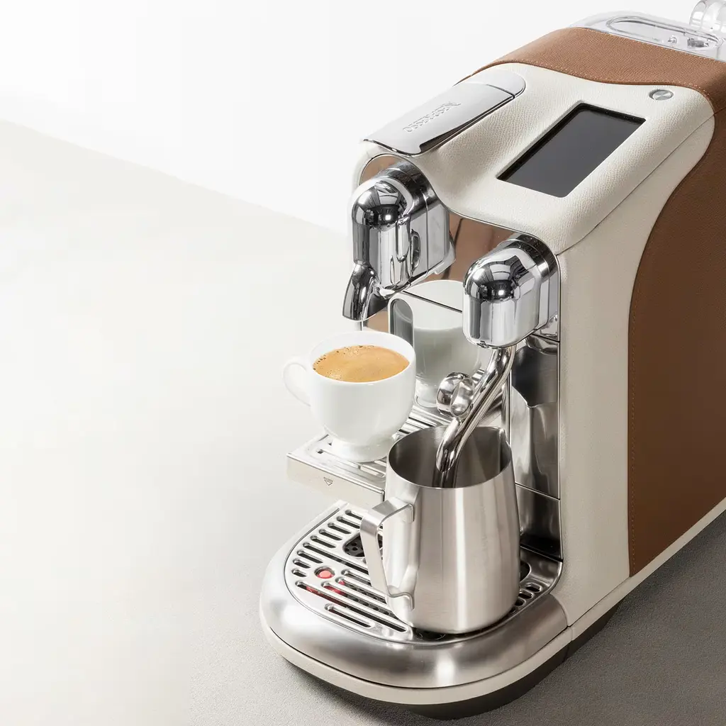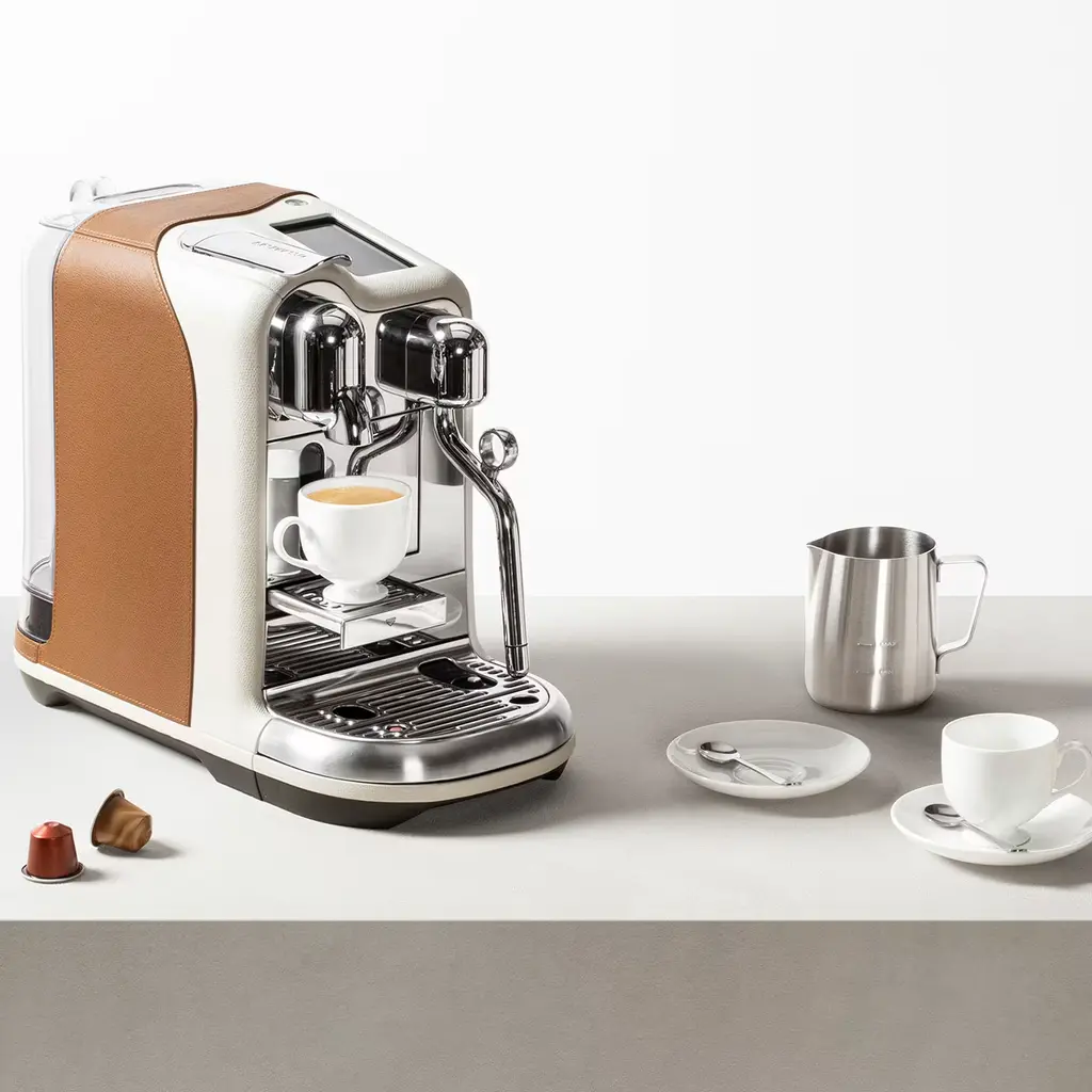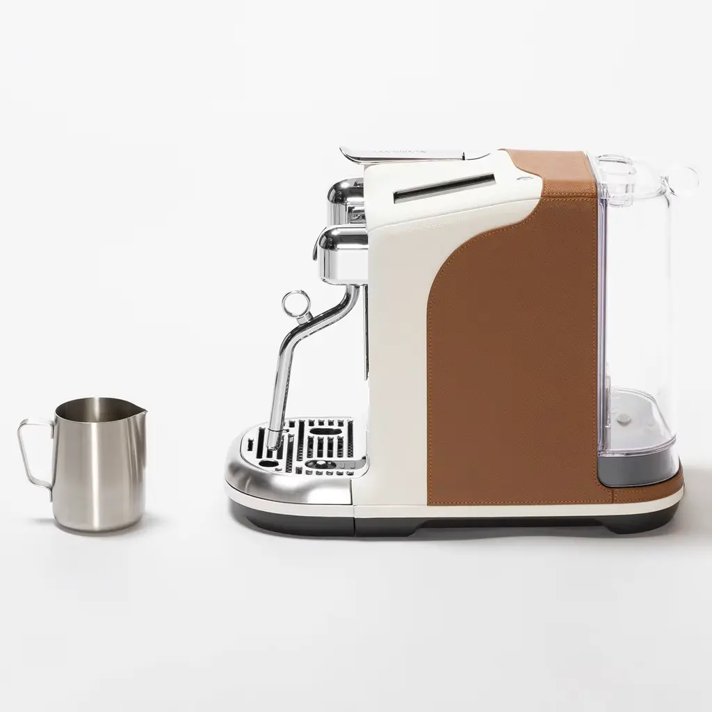 Leather-bound Nespresso machine with a smooth, wavy decorative motif. It uses classic Nespresso capsules and includes the possibility to pour just hot water. It boasts an array of different milk recipes thanks to its built-in milk frother and the interactive touch screen, which allows to customise settings at will to make one's own signature coffee. Personalised drinks can be saved to the drinks menu. It comes with a stainless steel milk jug. Voltage available: 220V.