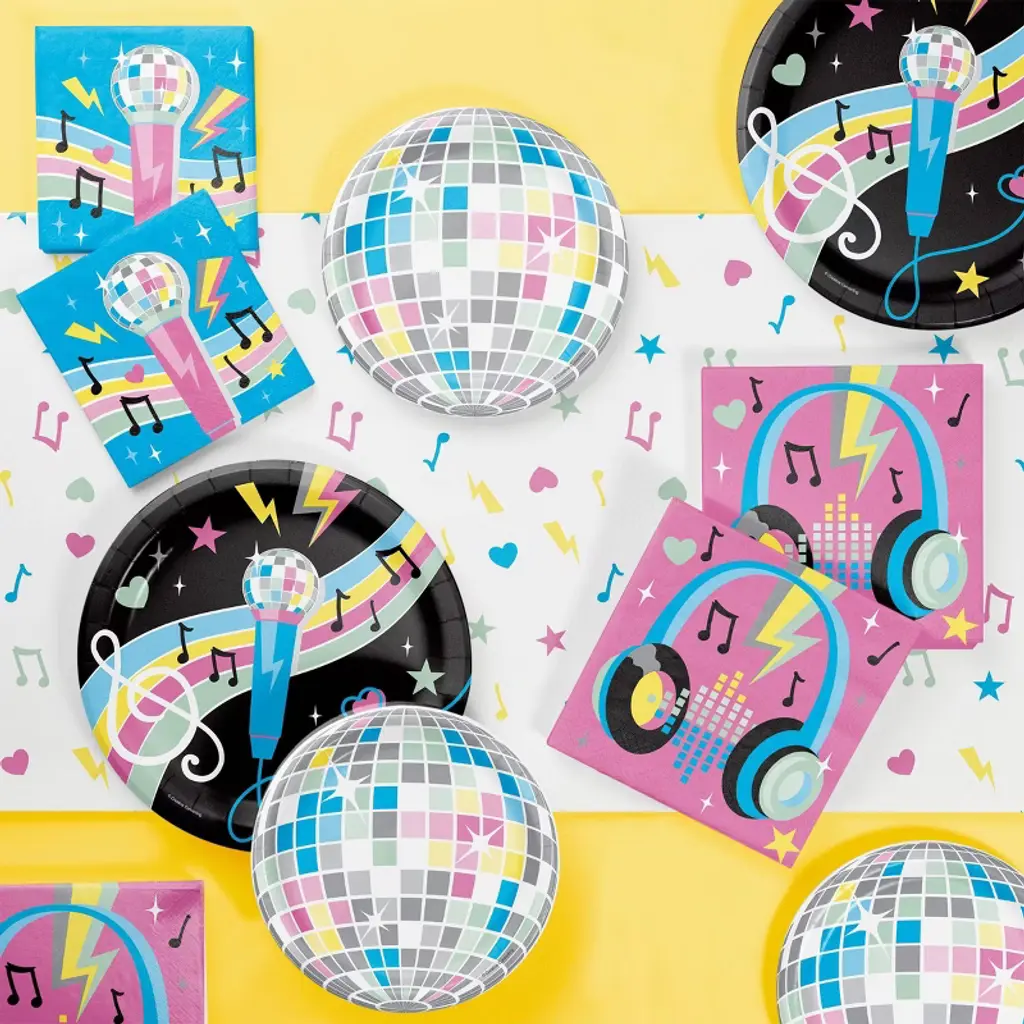 Set a groovy party table at your next birthday celebration with this Birthday Beats Disco Party Tableware Set! This kit comes with everything you need to serve a memorable meal for 8 guests with ease. You'll receive 9" round plates for your main course, 7" dessert plates, 5" cocktail napkins, 6.5" dinner napkins, and a tablecover measuring 54" x 96" to complete the look. It's the perfect kit for anyone who loves music and will help bring a unique theme to life. Hosting an epic party has never been easier with this complete set!