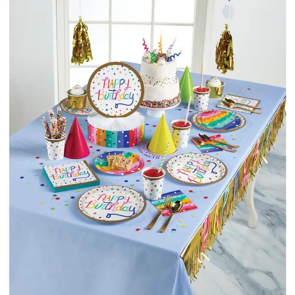 Each Birthday Confetti Tableware and Decorations Kit contains: 8 Birthday Confetti Happy Birthday Paper Plates (9"), 16 Birthday Confetti Happy Birthday Napkins (6.5”), 1 Birthday Confetti Paper Tablecloth (102” x 54”), Birthday Confetti Centerpiece (9” x 12”), and 1 Birthday Confetti Happy Birthday Banner (5'). Sprinkle some excitement at the party when you use the Birthday Confetti Deluxe Tableware and Decorations Kit. This kit has all the paper plates and napkins you need to serve a meal to a gathering of 8 people. The party supplies feature glittering confetti, and the words Happy Birthday with a red, yellow, white, pink, blue, and gold theme. Throw a wonderful birthday party with help from this kit!