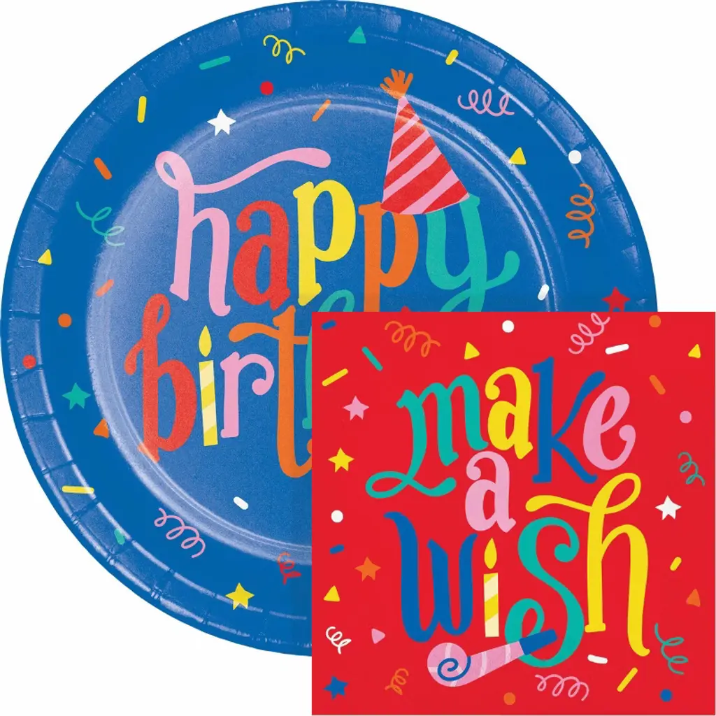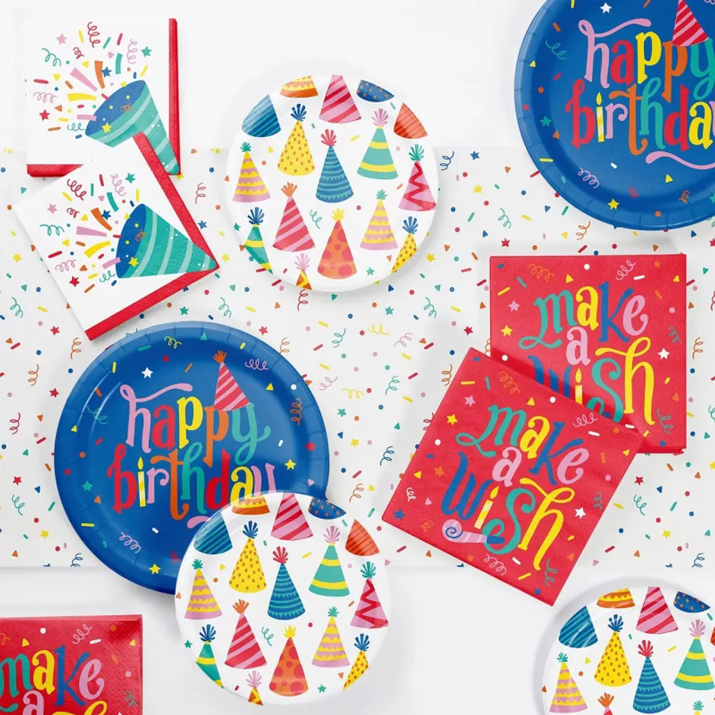 Throw a colorful and festive birthday party with this Hats Off Birthday Hats Tableware and Décor Set! This kit comes with everything you need to serve a memorable meal for 8 guests and elevate your party space. You'll receive 9" round plates for your main course, 6.5" napkins, a tablecover measuring 54" x 96", a honeycomb centerpiece, and a "Happy Birthday" banner to complete the look. It's the perfect kit to celebrate any special birthday. Hosting an epic party has never been easier with this complete set!