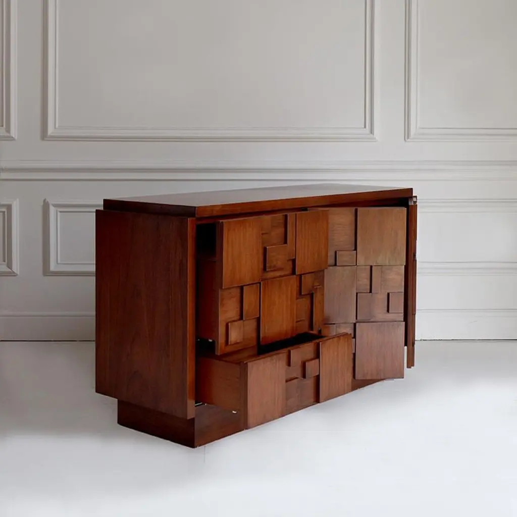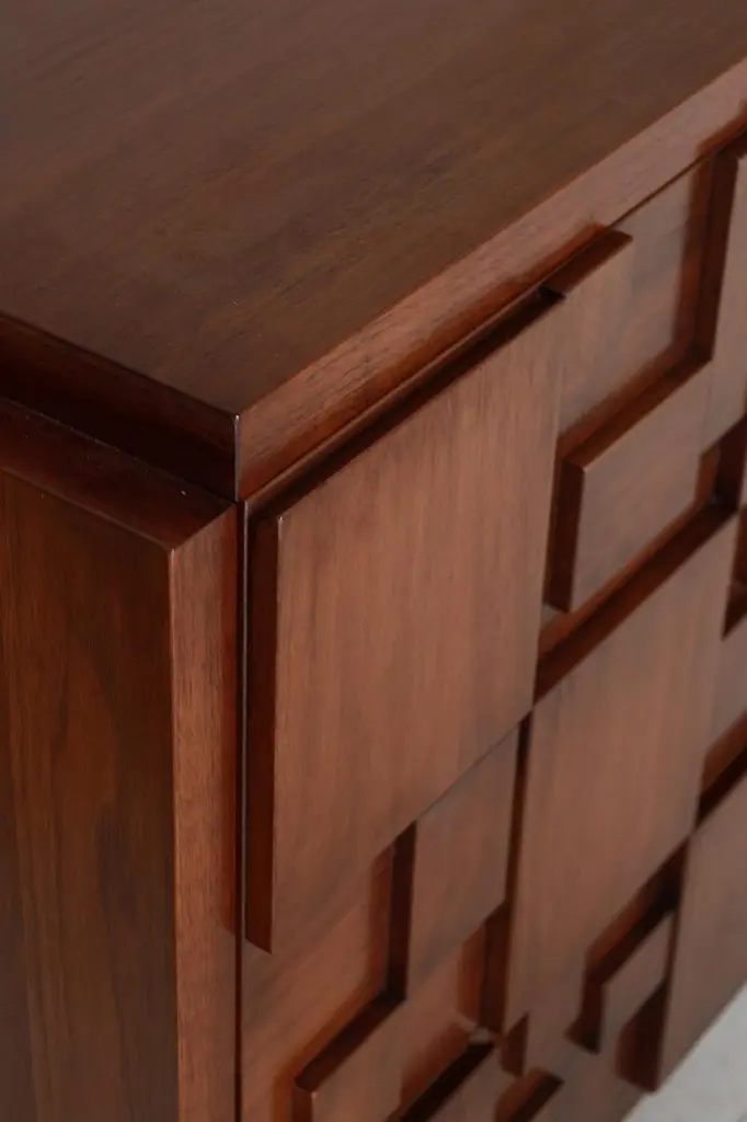 Part of The Modernist Collection, inspired by the work of American-born furniture designer, sculptor, and artist Paul Evans, this credenza reflects the true essence of the brutalist style. Made with varied blocks of wood attached to the front, it lends an imposing and dramatic look while retaining the rich colour and warmth of the walnut wood. Featuring two generous drawers on the left side while featuring double doors on the right side.Handcrafted from solid Canaletto walnut wood, the Credenza isn’t just about looks—it’s about lasting quality. Reflecting Italy’s rich heritage of craftsmanship, the sturdy construction ensures that this sideboard will remain a centrepiece in your room for years to come.Dimensions:-H 80 x W 140 x D 45 cm