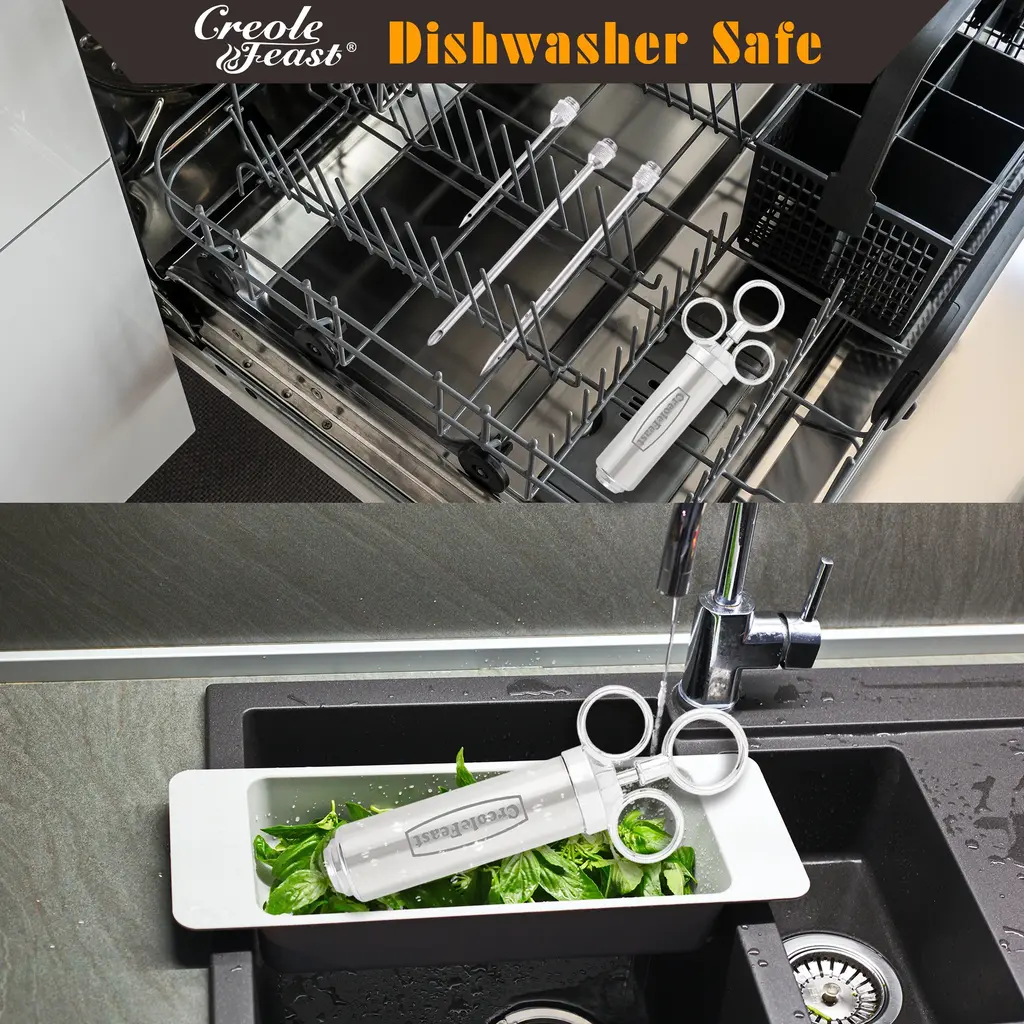 People always say the chef’s mood affects the taste of food. But it is deduced that most culinary lovers might have an unpleasant experience to spend too much time in marinating or soaking food before cooking. Now, your must-have and practical kitchen hand is here – Creole Feast IS1001 Stainless Steel Meat Injector Syringe Kit with 3 Marinade Injector Needles, which brings you a totally new experience of soaking. Just choose correct needles based on the type of marinade and size of meat, then press the plunger, the injector penetrates deep to deliver marinades throughout. No more dry food, no more long-time waiting, but more time to enjoy delicacy. 1. Safe and Durable: This meat injection syringe kit is made of approved food-grade and premium quality heavy-duty stainless steel, ensuring your family and friends safe and healthy, as well as keeping tools sturdy, rust-resistant and longtime use.2. Package Contents: Come with meat injection barrel, 6" 12-hole needle, 6" open-ended needle, 3" 2-hole steak needle, 2 needle cleaning brushes, 5 spare silicon O-rings, premium flip-top cardboard outer gift box and custom foam insert.3. 3 Multifunctional Needles: Includes 1 x 6" 12-hole needle for injecting liquid marinades into thick meat, 1 x 6" open-ended needle for pureed marinades and 1 x 3" 2-hole steak needle for injecting liquid marinades into thin cuts of meat.4. Easy Operation: Ergonomic threaded design for conveniently dismantling and easy assembly. Handle plunger with three circle-shaped rings is designed for greater grip and trouble-free pressure control of pulling and pushing with just one hand.5. Dishwasher Safe: The syringe and needles are readily clean. Just place the injector under the running water or into the dishwasher after use, which saves a lot trouble. The cleaning brush inside the kit can also help for thoroughly cleaning.