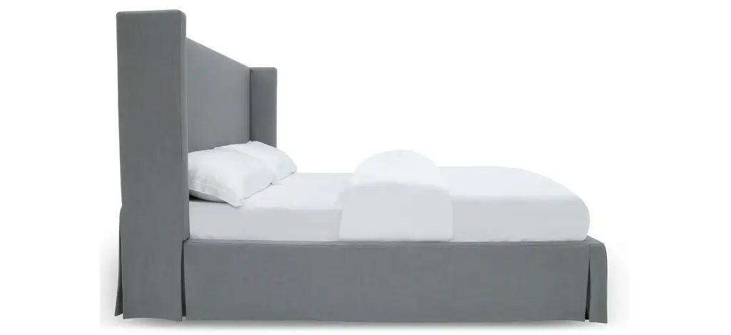 The Cresta Upholstered Skirted Full Panel Bed brings relaxed luxury to your bedroom. Made with solid wood framing, layered foam and soft linen-blend fabric, this group creates a no-maintenance slipcover look with skirted bases and inverted corner pleats. Available in panel, wingback, camelback and clipped corner configurations.