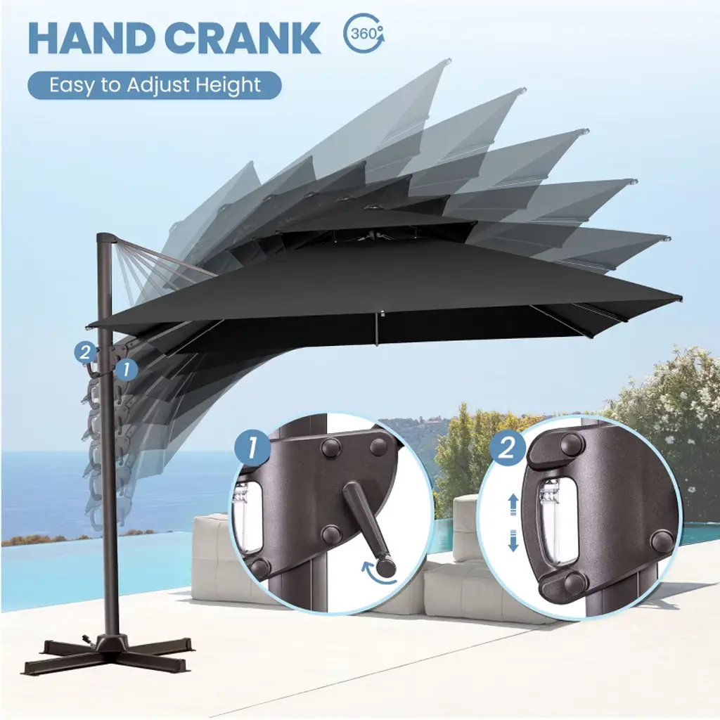 Stay cool and comfortable outdoors with theThis 10FT Square Adjustable Offset Cantilever Hanging Patio Umbrella. Featuring a double top design and a single wind vent, this deluxe 10 x 10 ft patio umbrella is perfect for sunny days. The durable polyester fabric is waterproof and UV resistant, while the metal frame ensures stability. With a 2-in-1 crank mechanism, 6 tilt positions, and 360-degree rotation, it's easy to adjust for optimal shading. Available in various colors.
