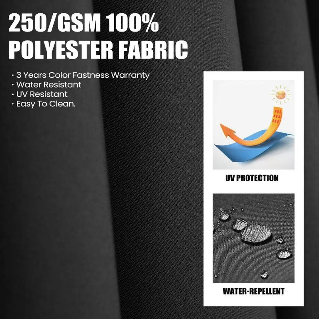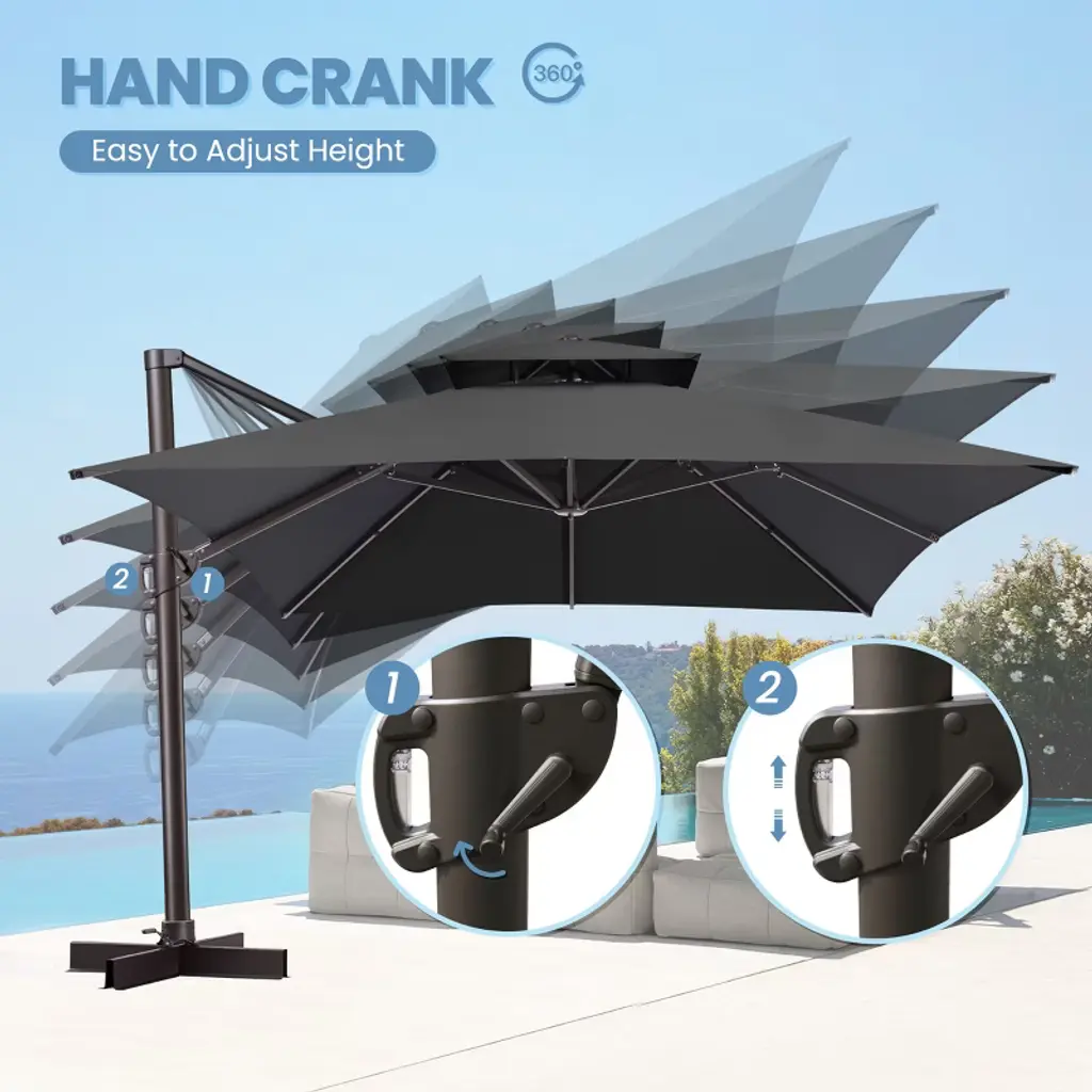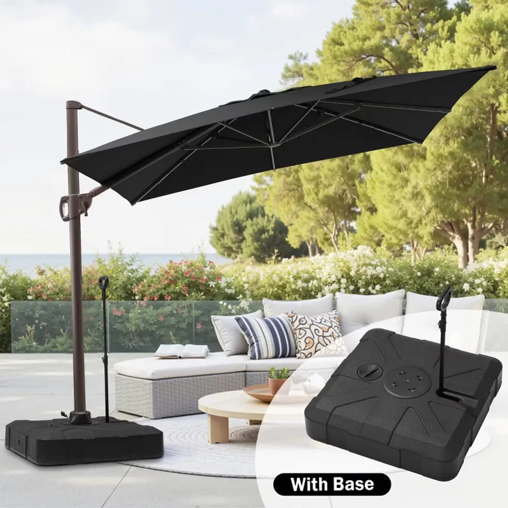 Our beautiful patio cantilever umbrella enables you to enjoy an outdoor relaxing time in the hot summer with great shade. Made of solid and durable metal parts, this outdoor offset umbrella can adapt to the harsh outdoor climate. The canopy which is made of durable polyester fabrics is waterproof and UV resistant. What's more, this offset umbrella opens and closes quickly and features 5 tilt positions to provide optimal shade any time of day. It's perfect for gardens, balconies, decks, swimming pools, or cafes.