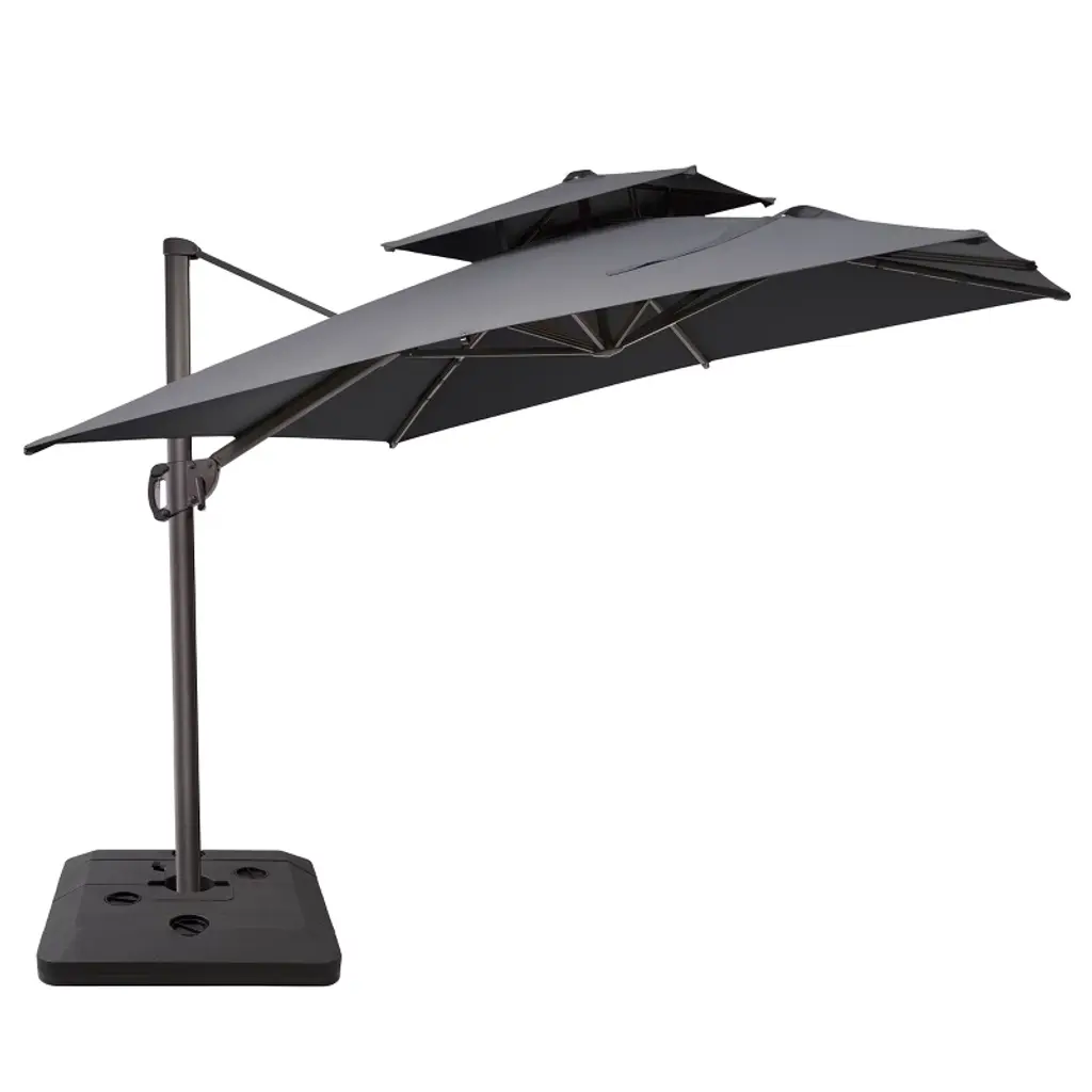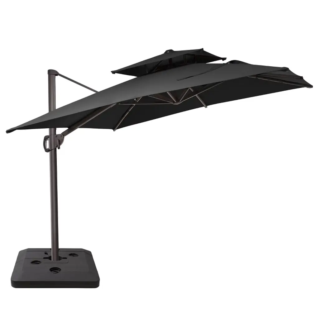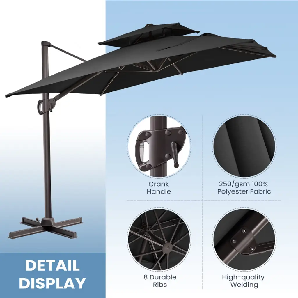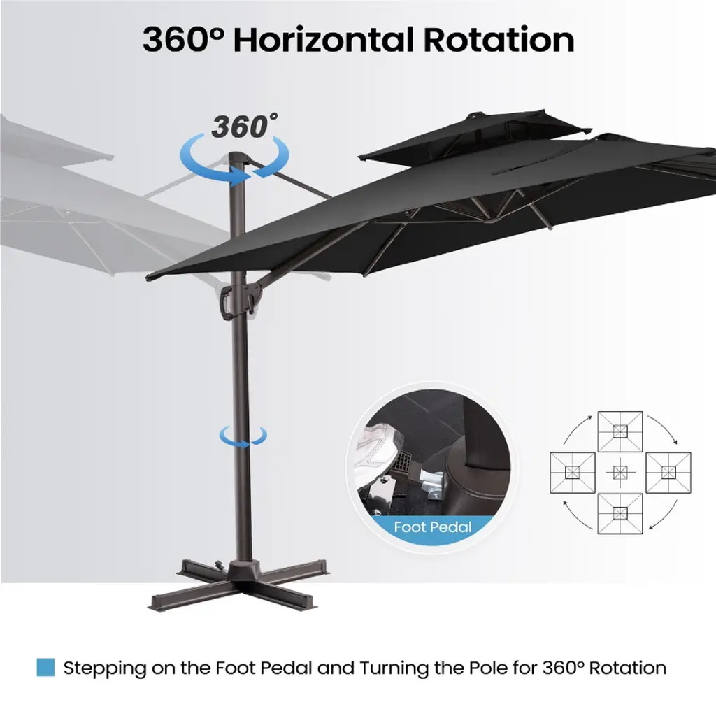 Create a comfortable outdoor space with 11X9 ft Rectangular Outdoor Double Top Patio Cantilever Umbrella by This. Made with a sturdy metal frame and coated with powder, this umbrella is designed to last. The wind vent promotes air circulation and adds elegance to the offset hanging shelter of the double top. The unique handle design for the crank system makes it easy to open and close and features six adjustable positions for optimal shade. The umbrella also has a 360-degree pole rotation with a foot pedal. Available in Black, Tan, Navy Blue, and Dark Grey.