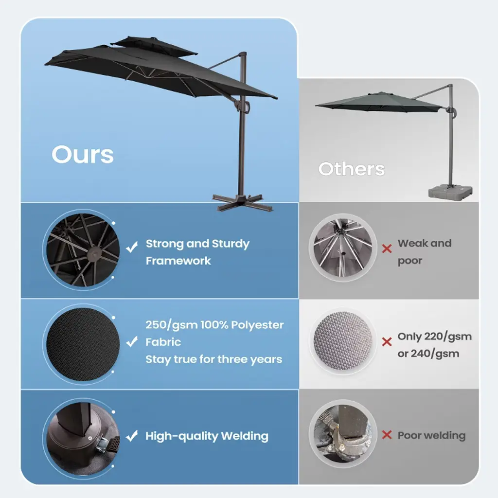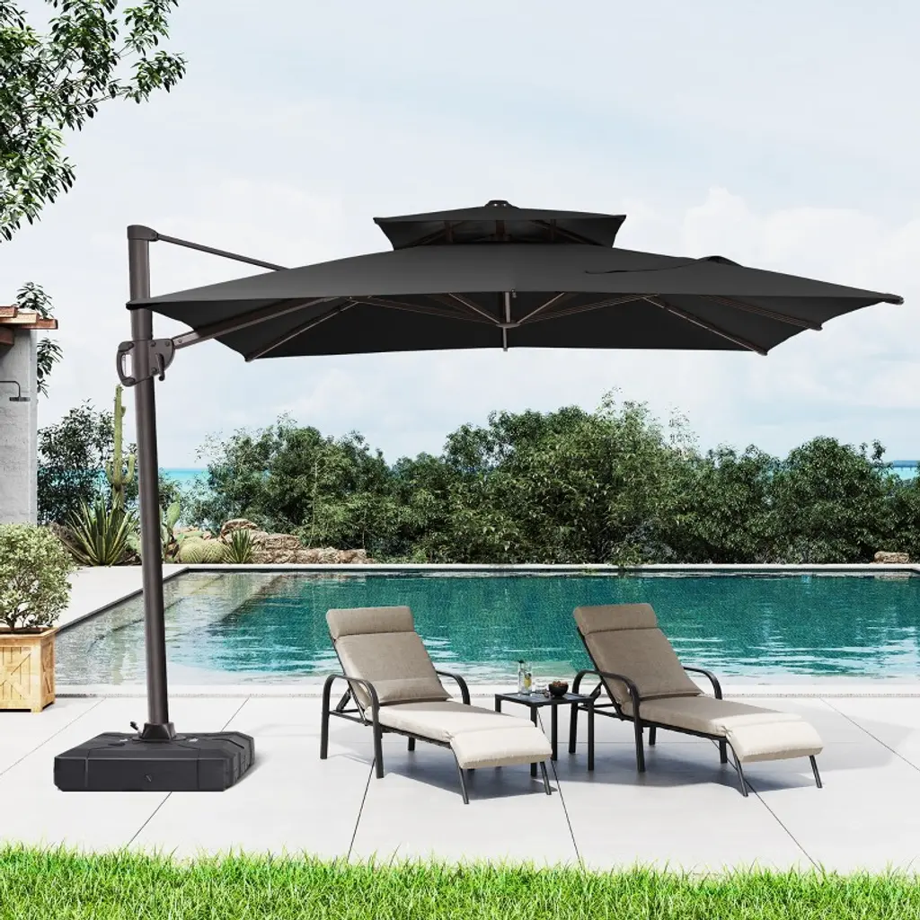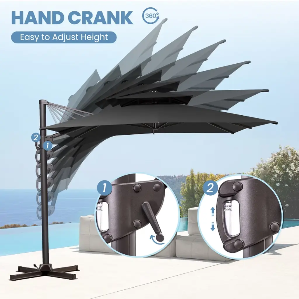 Create a comfortable outdoor space with 11X9 ft Rectangular Outdoor Double Top Patio Cantilever Umbrella by This. Made with a sturdy metal frame and coated with powder, this umbrella is designed to last. The wind vent promotes air circulation and adds elegance to the offset hanging shelter of the double top. The unique handle design for the crank system makes it easy to open and close and features six adjustable positions for optimal shade. The umbrella also has a 360-degree pole rotation with a foot pedal. Available in Black, Tan, Navy Blue, and Dark Grey.