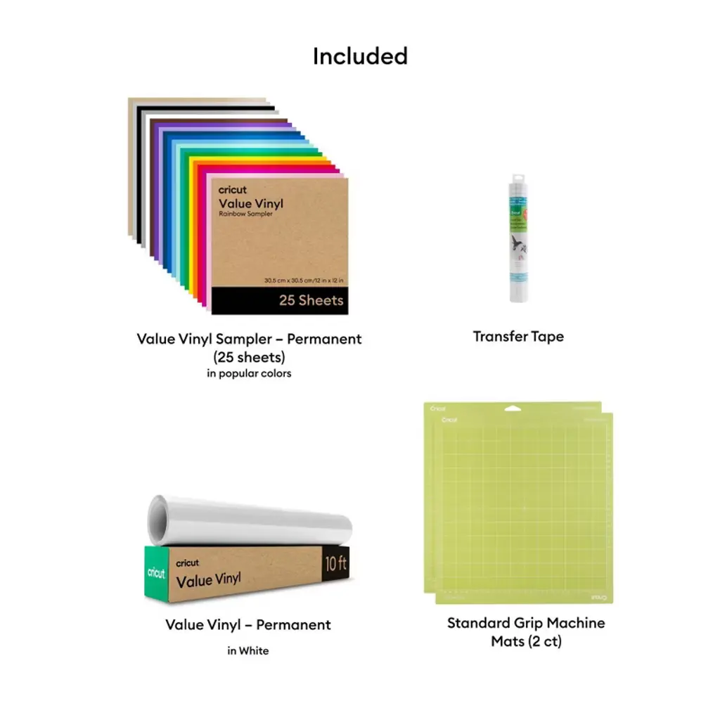 Customize with confidence! With Cricut® Value Vinyl, you can DIY personalized decals, labels, and so much more. The material is dishwasher friendly* and has a plastic PET backer for a frustration-free mat experience. Cricut Value Vinyl has been engineered to give you the perfect blend of cost and quality. By selling in bulk sizes and with simple packaging, we pass the savings on to you. Optimized for Cricut cutting machines with automatic cutting settings in Design Space® for every Cricut material, machine & project. Bundle includes Value Vinyl, Transfer Tape, plus machine mats to kickstart your creativity and bring your vinyl dreams to life.