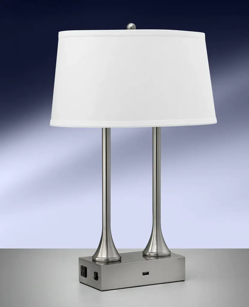 Standard Lamp Specifications for #U2E700:Product Type: Desk LampHeight: 27''''Finish: Brushed SteelConstruction: SteelSocket: (2) Aluminum On/Off Med. Base Type A 60W Max socket(s). (Bulb not included)Switching: (2) On/Off Rocker switch(es) located on the base.Cord: 6''5'' (from base) long black 16 gauge cord set with a 3 prong grounded plug.Electrical Outlet: (2) 3 prong grounded outlet(s).Data Port: None.USB Port: (1) 10W/2A USB port(s).UL/CUL and/or ETL listed: YesHarp Pipe Size: 8.5 inches (bead-to-bead)Standard Packing: 2 per carton (shade packed separately).Lamps & Shades per SKU: 1Lamping: (2) Aluminum On/Off Med. Base Type A 60W Max socket(s).Shade Size and Description: White fabric laminated to oval styrene hardback with self fold trim measuring 9.5"/16" x 12"/18" x 9.5" w/ .5" drop (Top x Bottom x Slant).Bulb Included: NoMaterial Description: constructed from polished, plated, and lacquered steel.
