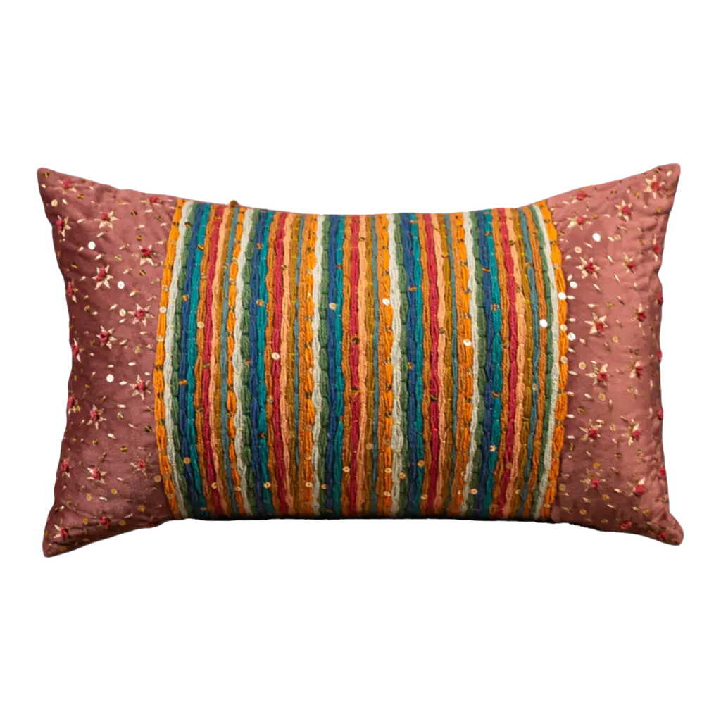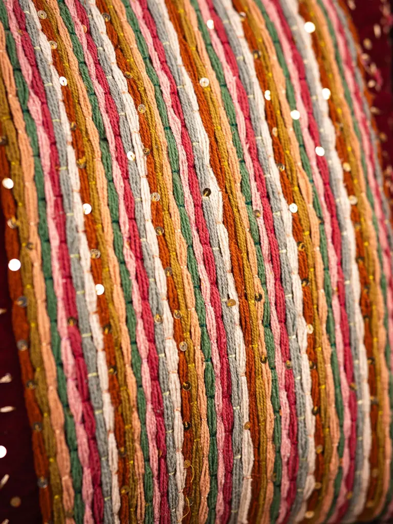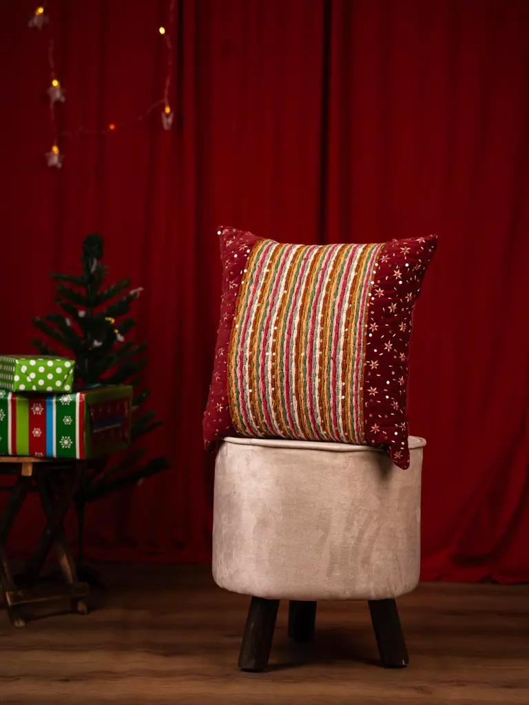 "Infuse vibrance into your space with this deep red cushion, featuring a bold striped panel in earthy tones accented by delicate golden embroidery. The shimmering star-like embellishments add a festive and luxurious touch, making it a perfect choice for elevating your holiday decor. Material: Velvet" Care:- "Hand Wash Plain Wash Dry Clean / Spot clean Do not bleach Do not iron print, Do iron on the reverse Do not pull any yarn; trim with a scissor Do not rub the stain" "Please note: All of our products are meticulously handcrafted by artisans. We pay close attention to the product's quality, appearance, and feel. However, because of the participation of humans in the manufacturing process, a little amount of variation in the product's size, color, look, and quality is to be expected; however, this is what makes it unique. “The color of the product may vary depending on the display of your screen. Please note that there will be slight variations in appearance and designs as per the size ordered.”"