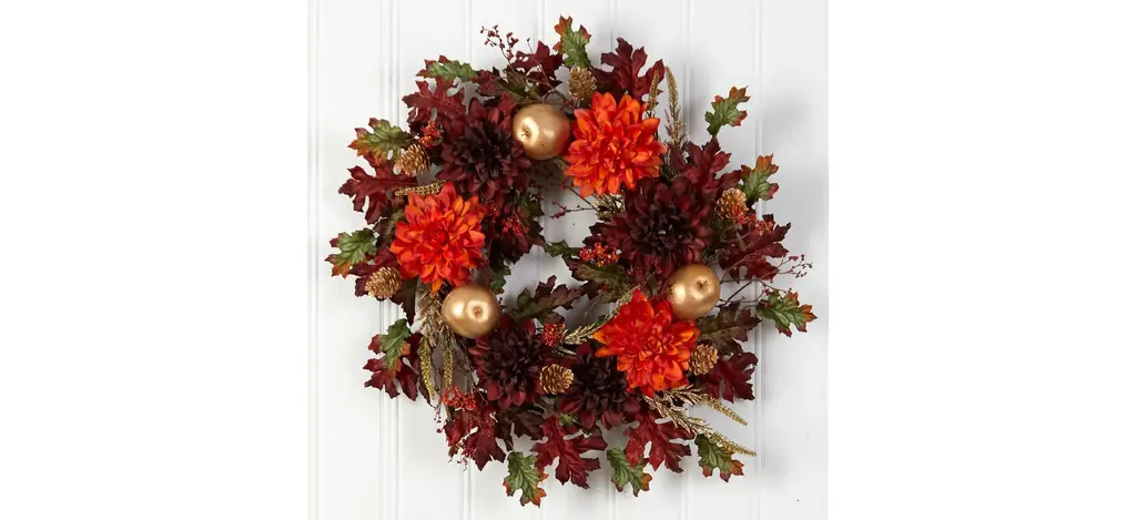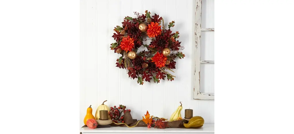 Get ready to dress up your home this fall with a Crisp 24" Dahlia and Golden Apple Wreath. Perfect for sprucing up a bare wall or an empty doorway.