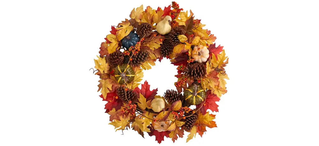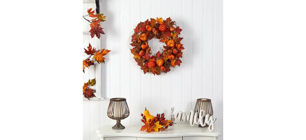 Get ready to dress up your home this fall with this Crisp 24" Maple Leaves and Pumpkin Wreath. Perfect to hang on your entry door, bare wall or even a table centerpiece to display items inside it.