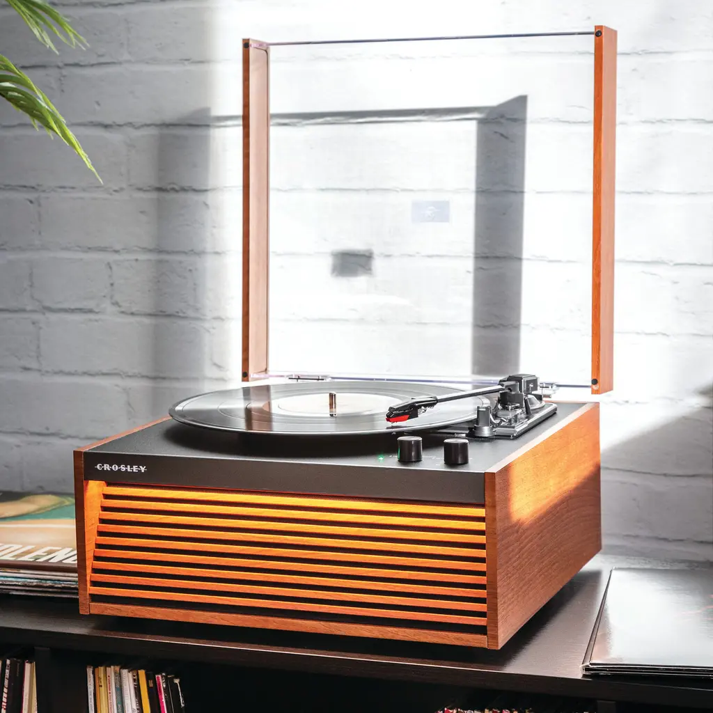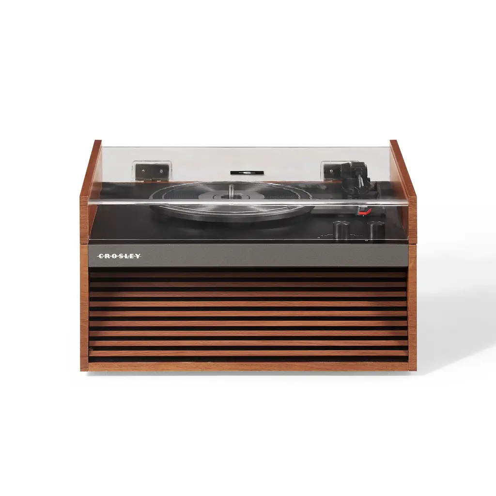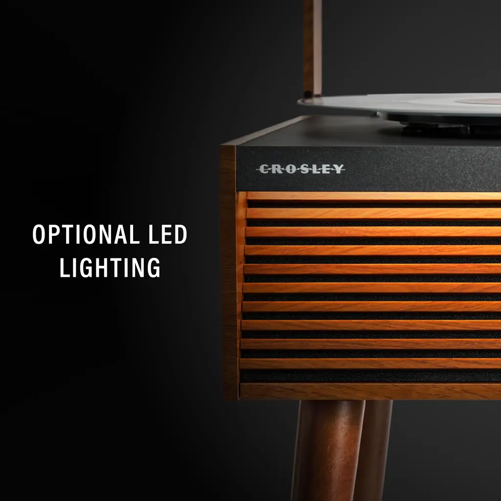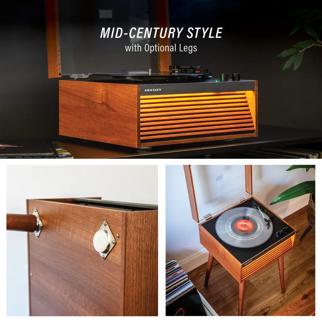 With its slatted front design and optional LED lighting, the Dean Record Player gives mid-century style a modern glow. The three-speed turntable can spin all your favorite records, and the built-in speakers deliver rich sound. Choose between the optional legs for a classic look or a tabletop setup for a more compact design. Plus, with Bluetooth and RCA connectivity, the Dean can easily stream your favorite playlists or adapt to external speakers. With the Dean, you're not just playing music; you're making a statement.