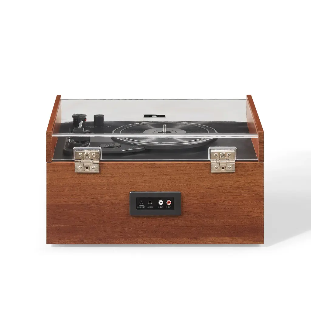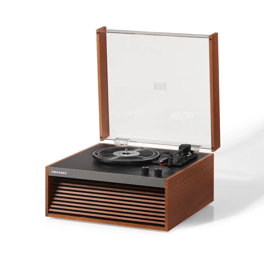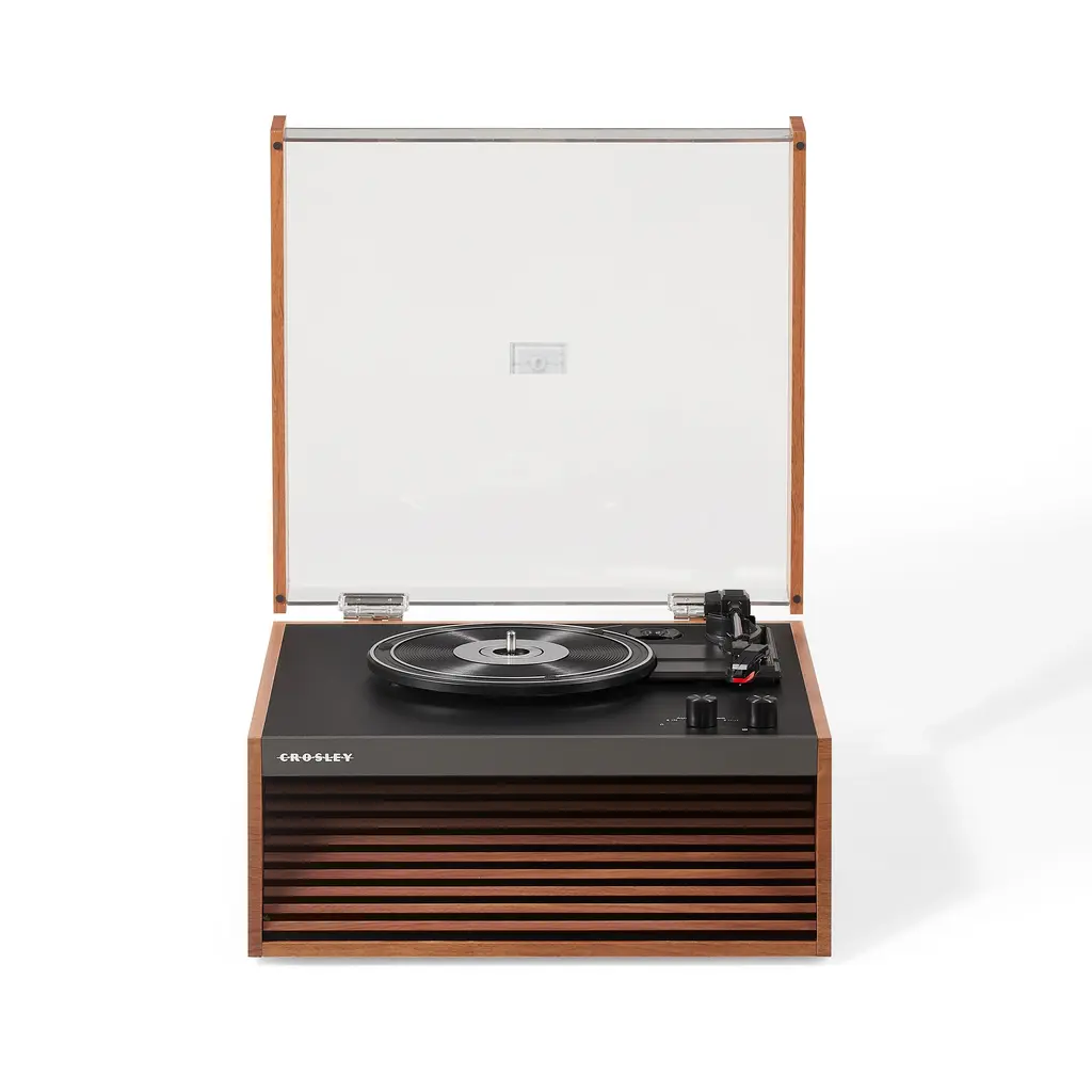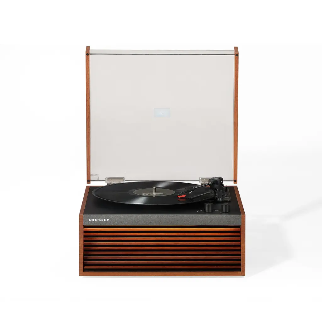 With its slatted front design and optional LED lighting, the Dean Record Player gives mid-century style a modern glow. The three-speed turntable can spin all your favorite records, and the built-in speakers deliver rich sound. Choose between the optional legs for a classic look or a tabletop setup for a more compact design. Plus, with Bluetooth and RCA connectivity, the Dean can easily stream your favorite playlists or adapt to external speakers. With the Dean, you're not just playing music; you're making a statement.