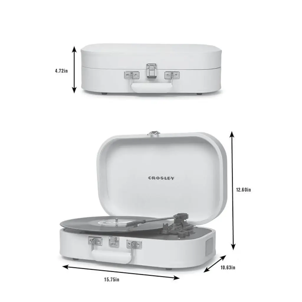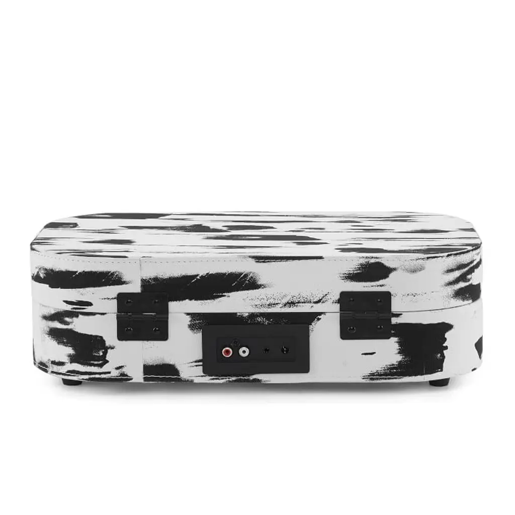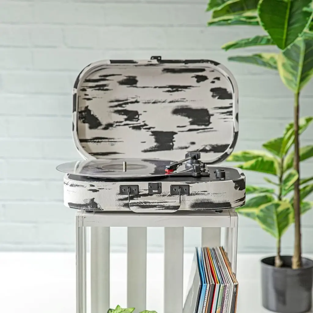 COPY 15.75"w x 10.6"d x 4.7"h. Wood, vinyl, metal and plastic in a Black & White finish. 3-speed turntable (33 1/3, 45 & 78 RPM). Built-in full-range stereo speakers. Built-in Bluetooth receiver. Aux input. RCA output. Headphone jack. Sold individually. Made in China.