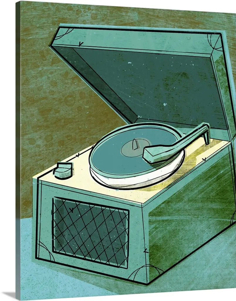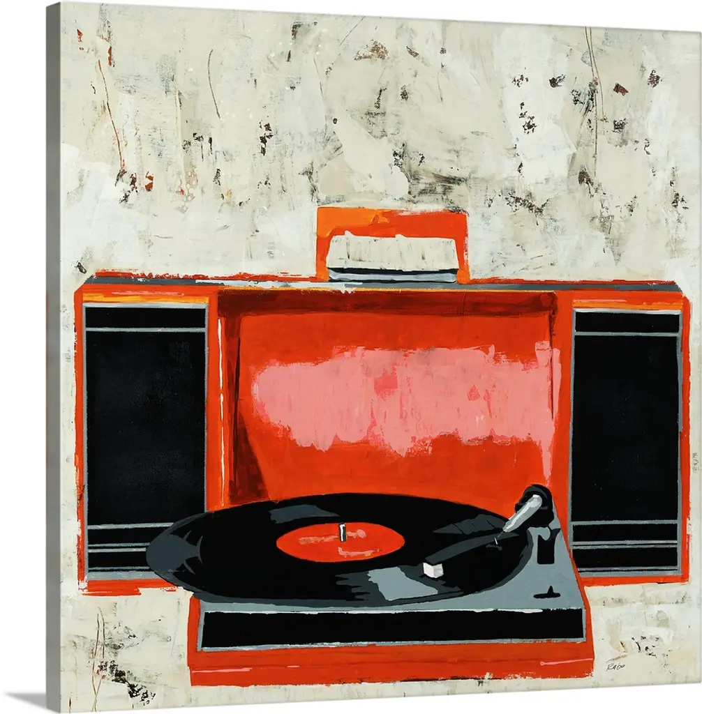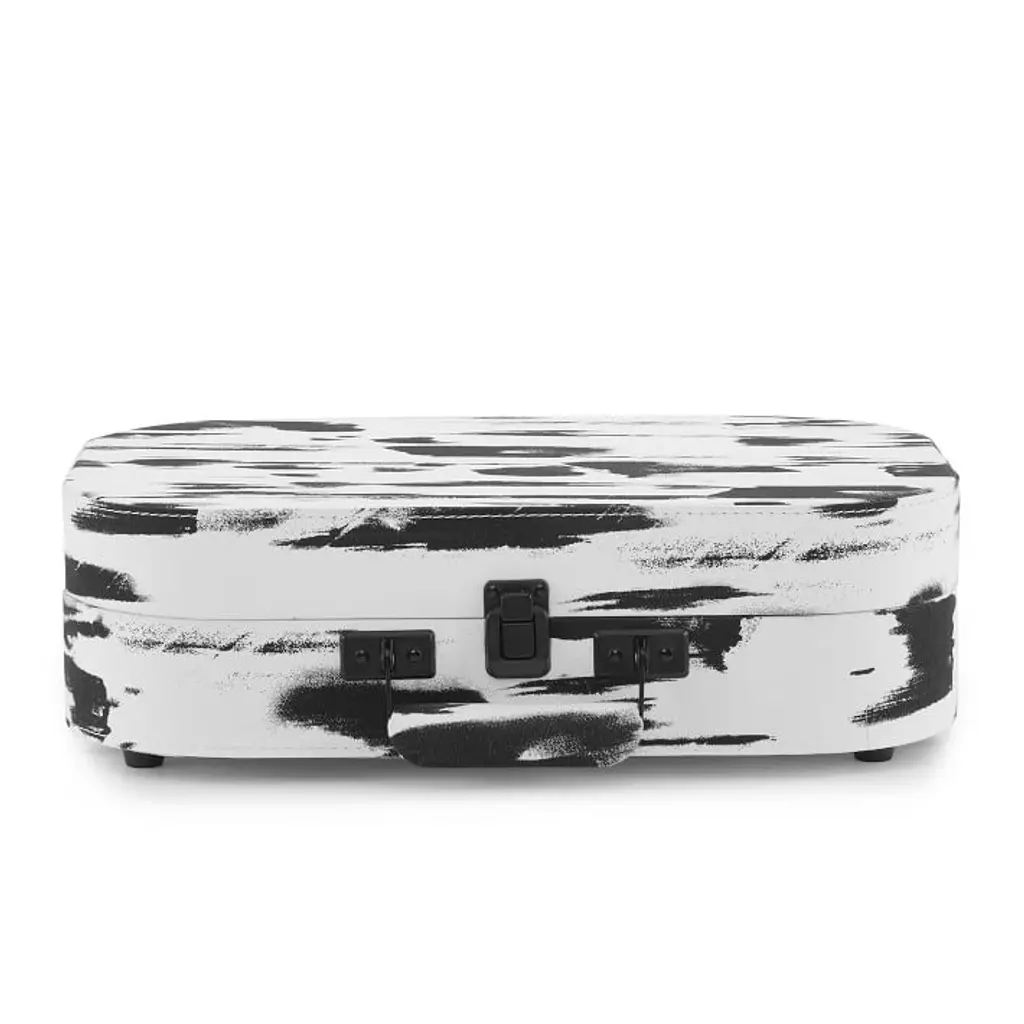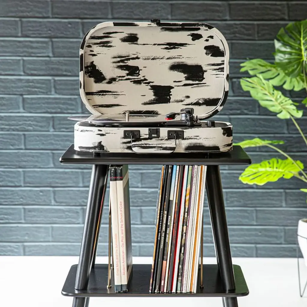 COPY 15.75"w x 10.6"d x 4.7"h. Wood, vinyl, metal and plastic in a Black & White finish. 3-speed turntable (33 1/3, 45 & 78 RPM). Built-in full-range stereo speakers. Built-in Bluetooth receiver. Aux input. RCA output. Headphone jack. Sold individually. Made in China.
