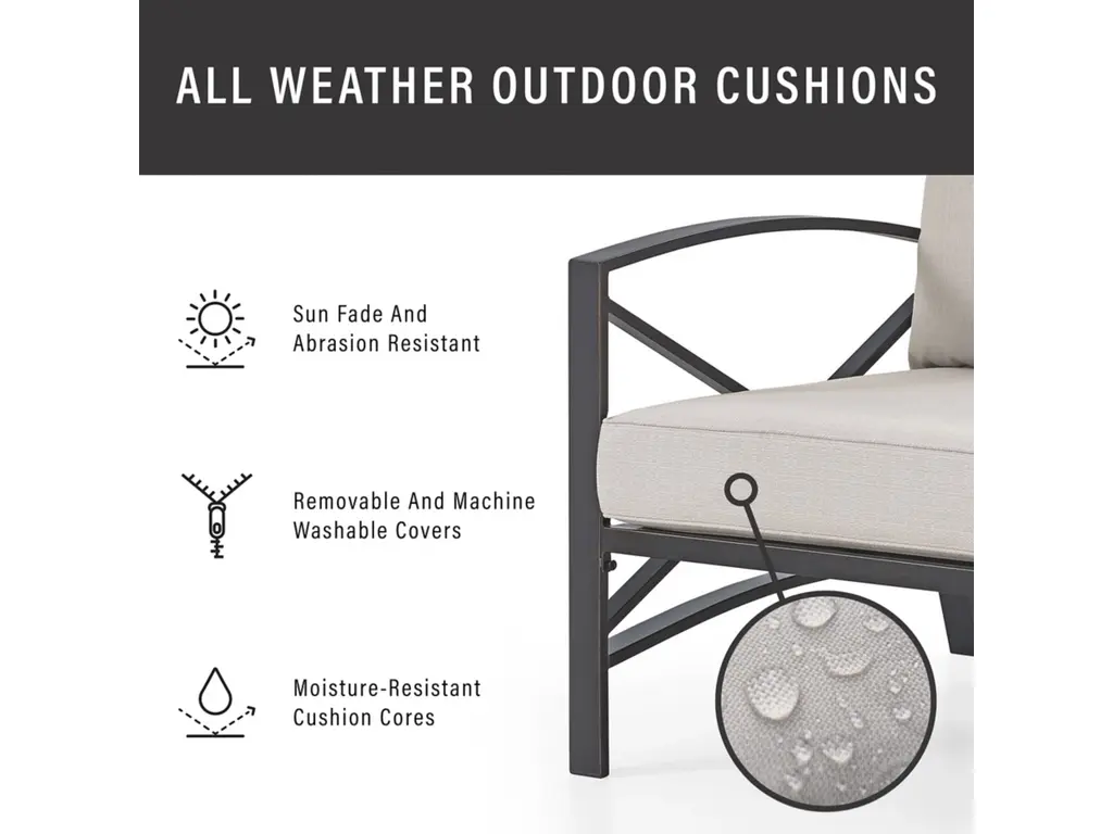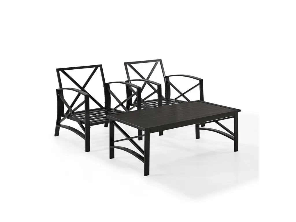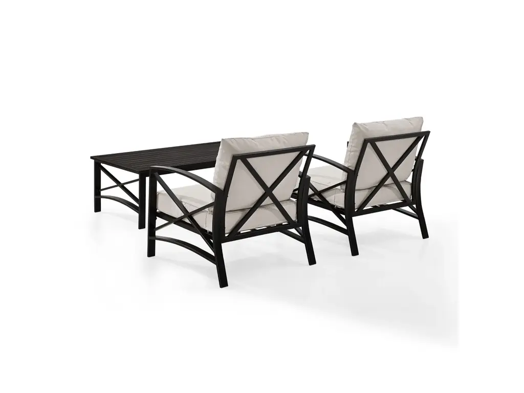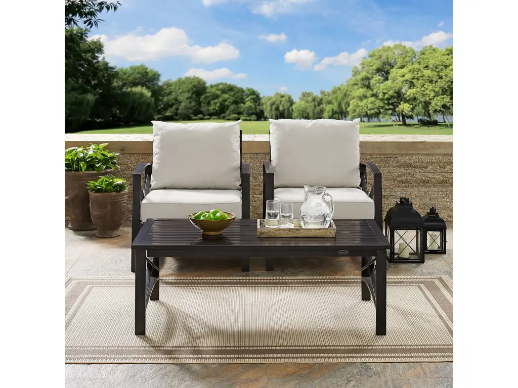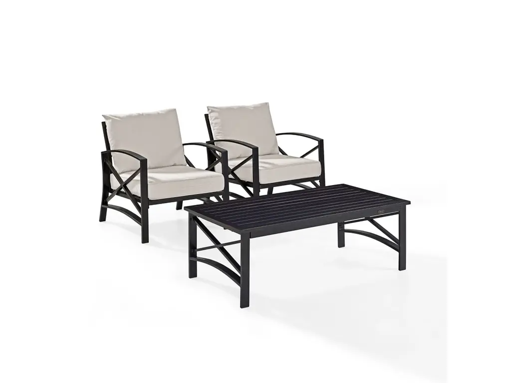 Settle in for a relaxing chat with the Kaplan 3Pc Outdoor Chair Set. Comprised of two armchairs and a coffee table, this outdoor furniture set features sturdy steel construction with a transitional x-back design. The comfortable seat and back cushions of each patio chair are covered in solution-dyed polyester, while the outdoor table showcases a classic slatted look. Enjoy lounging in the great outdoors with the Kaplan patio set.