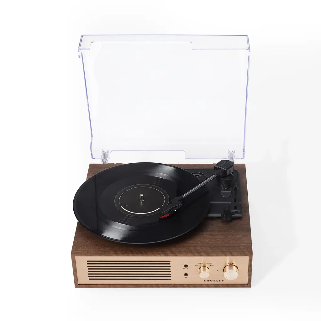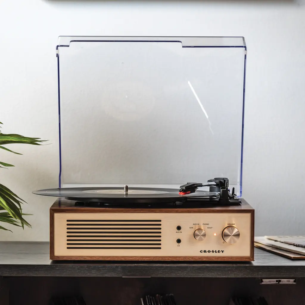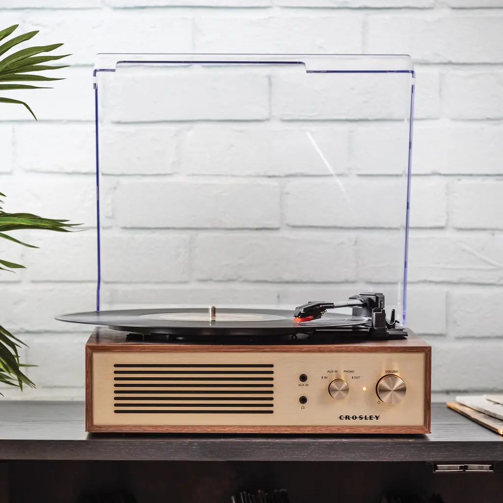 Miles is all about keeping things stylish, simple, and sounding great. Easy to set up and use, the Miles Record Player is great for anyone looking to get into vinyl. With three speeds, it's perfect for playing all your records. If you're in the mood for your favorite playlist or podcast, just turn on the Bluetooth and stream through the built-in speaker. Or use Bluetooth Out to stream vinyl to your favorite external speakers. With the brushed gold and wooden design, this is a great all-in-one player that will stand out in any space.