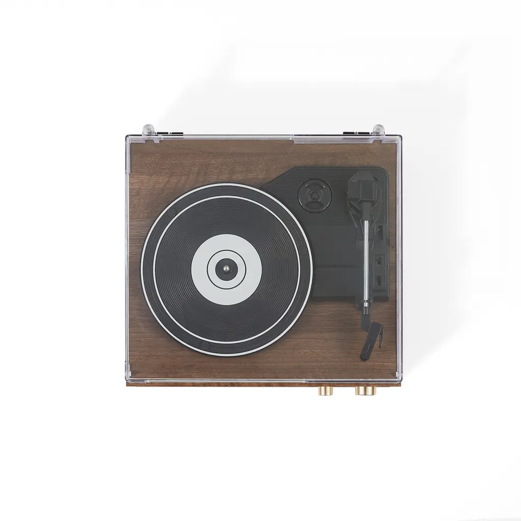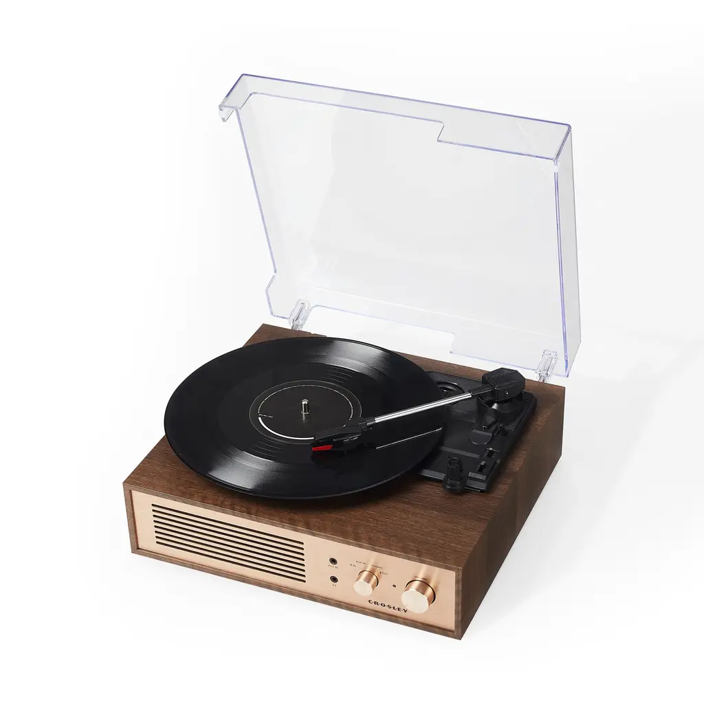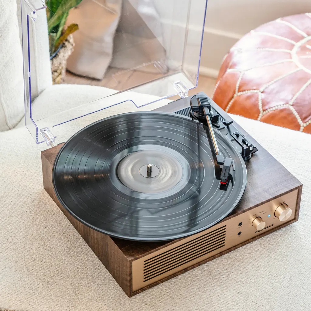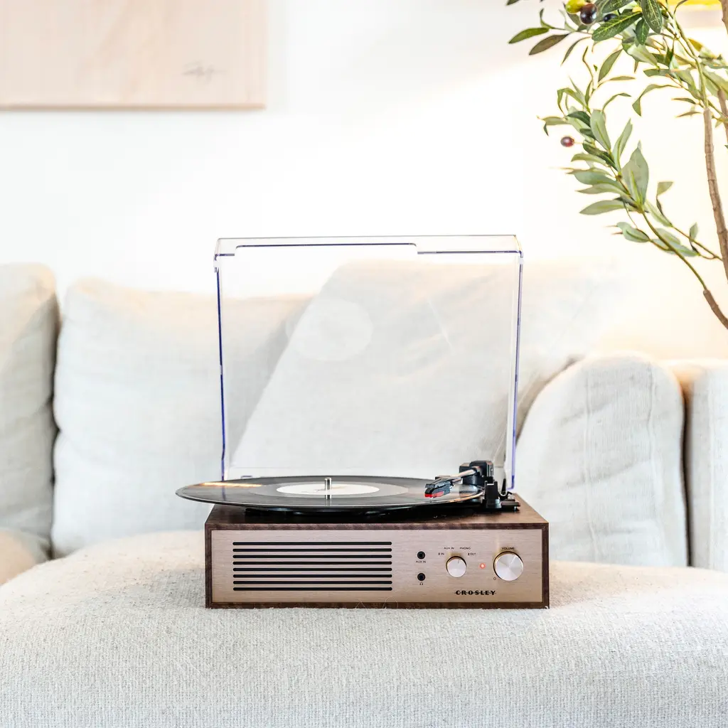Miles is all about keeping things stylish, simple, and sounding great. Easy to set up and use, the Miles Record Player is great for anyone looking to get into vinyl. With three speeds, it's perfect for playing all your records. If you're in the mood for your favorite playlist or podcast, just turn on the Bluetooth and stream through the built-in speaker. Or use Bluetooth Out to stream vinyl to your favorite external speakers. With the brushed gold and wooden design, this is a great all-in-one player that will stand out in any space.