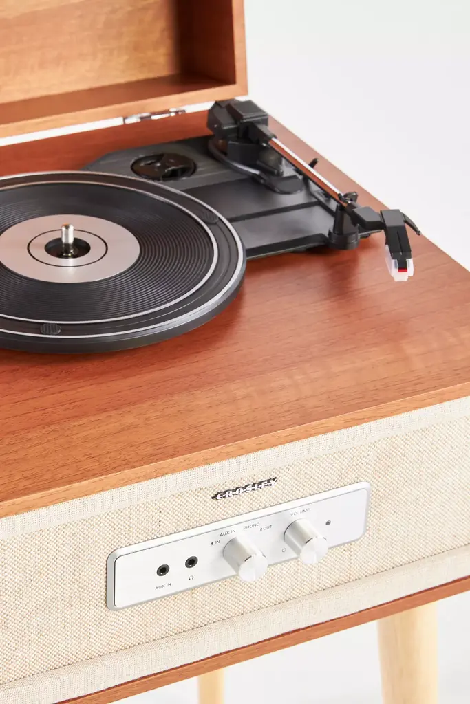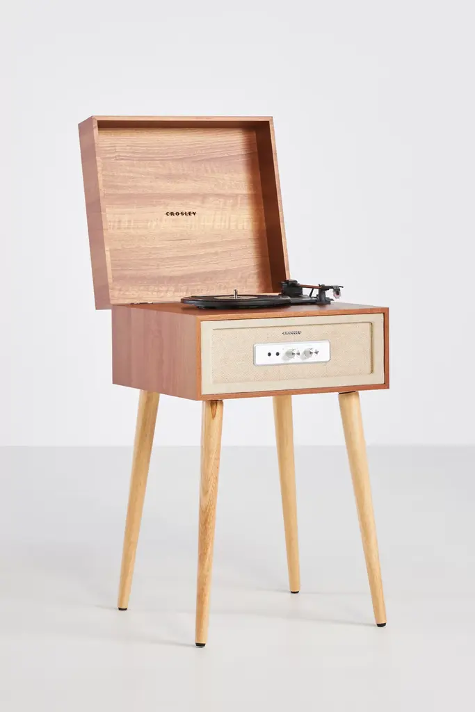 Perched on sleek wooden legs and sporting a classic mid-century look, the Rohe exhibits stunning retro design alongside modern sound and functionality. The three-speed turntable includes a built-in Bluetooth receiver, headphone jack, and aux input. And the removable legs allow it to perch atop your media console - or stand all on its own.