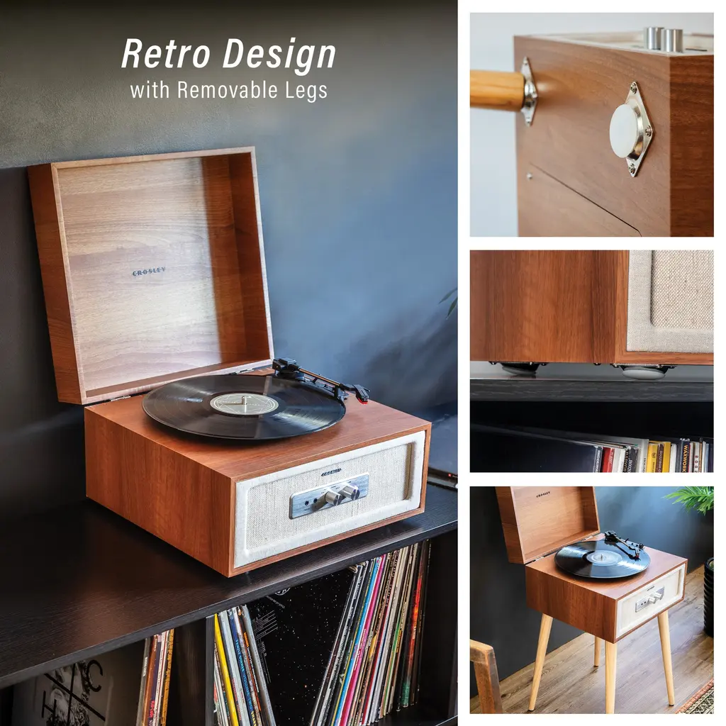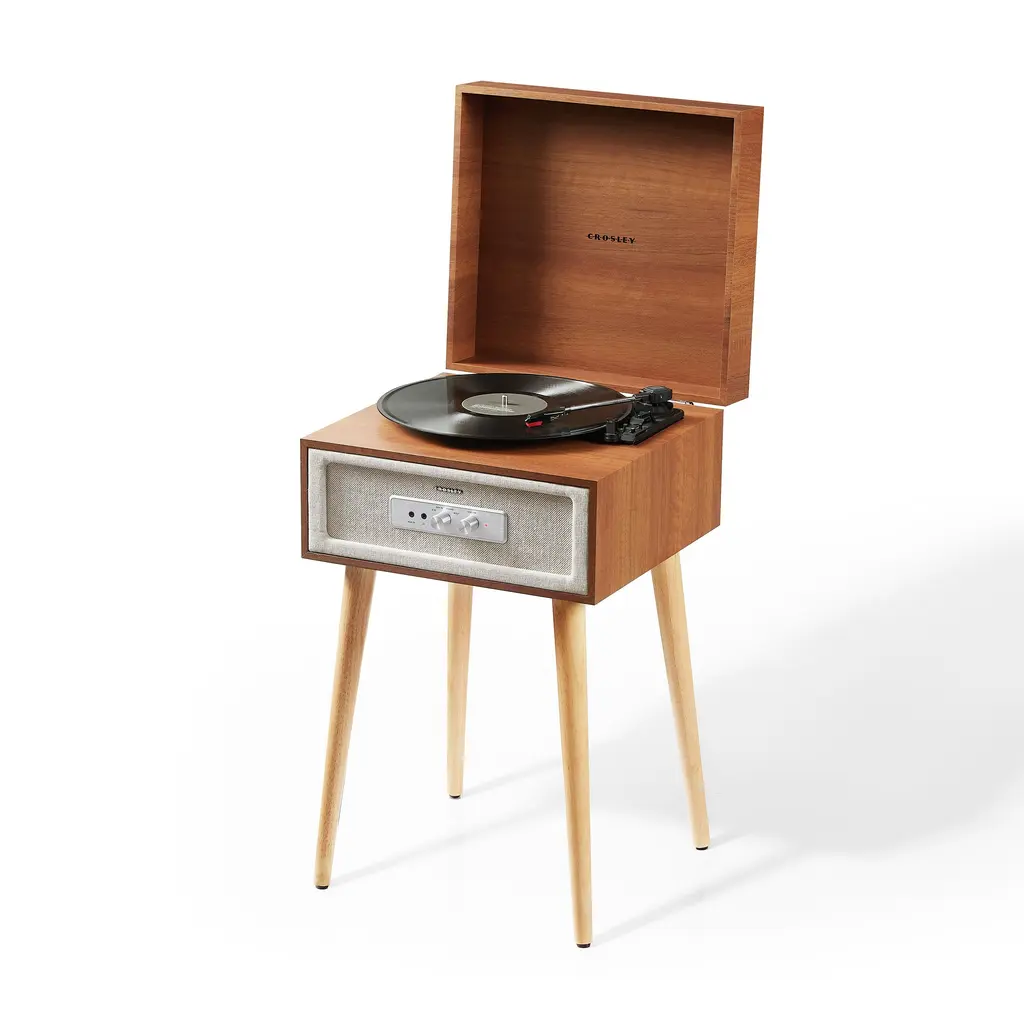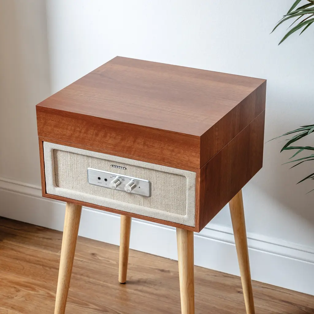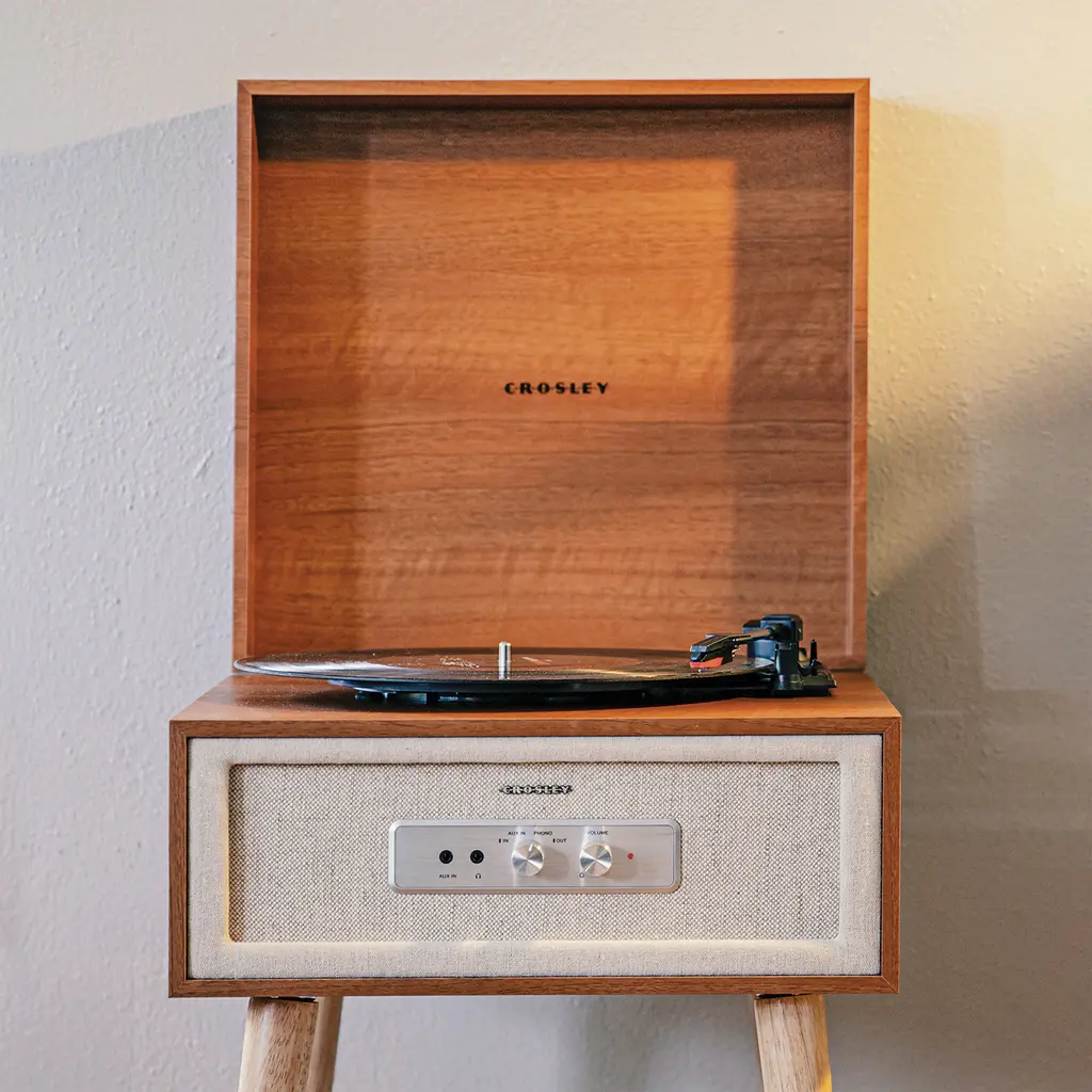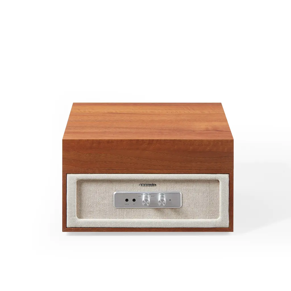 The Rohe is more than just a record player; it's a stylish statement piece for any music lover. With the option to use it on its tapered legs for a classic, mid-century modern look or without legs for a more modern appearance, it adapts to your personal style. This three-speed turntable includes a built-in Bluetooth receiver, headphone jack, and aux input, combining functionality with flair. Its natural wood finish makes it the perfect centerpiece for your music setup.