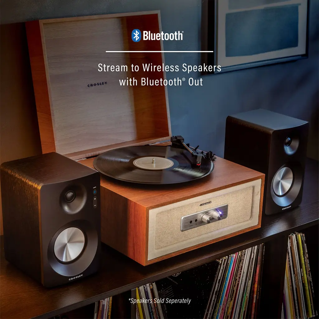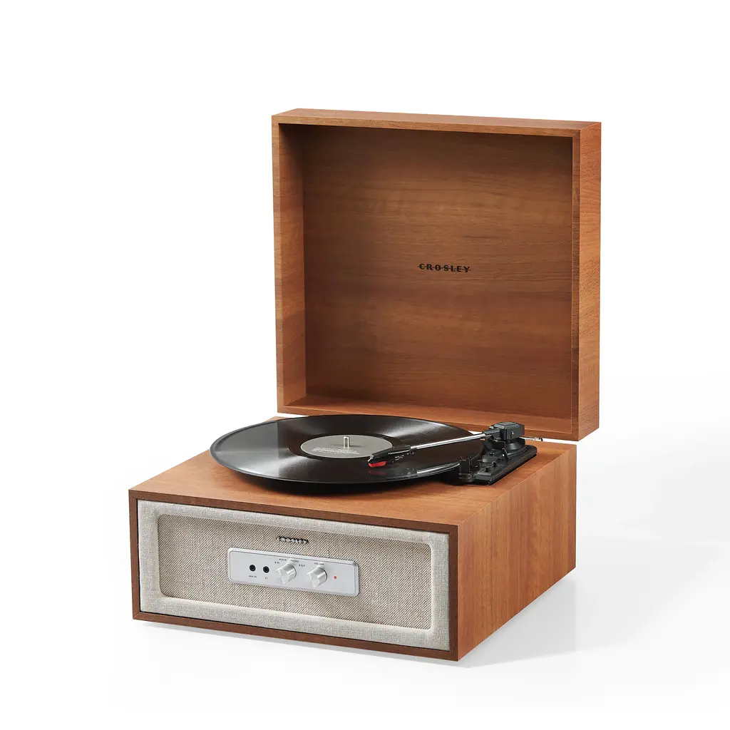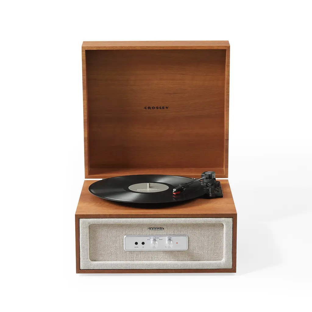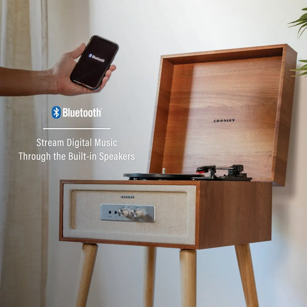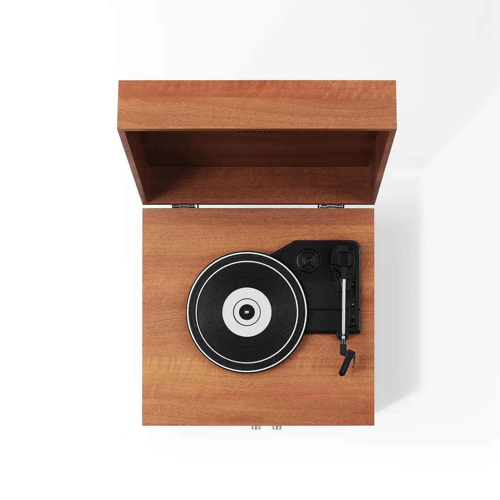 The Rohe is more than just a record player; it's a stylish statement piece for any music lover. With the option to use it on its tapered legs for a classic, mid-century modern look or without legs for a more modern appearance, it adapts to your personal style. This three-speed turntable includes a built-in Bluetooth receiver, headphone jack, and aux input, combining functionality with flair. Its natural wood finish makes it the perfect centerpiece for your music setup.