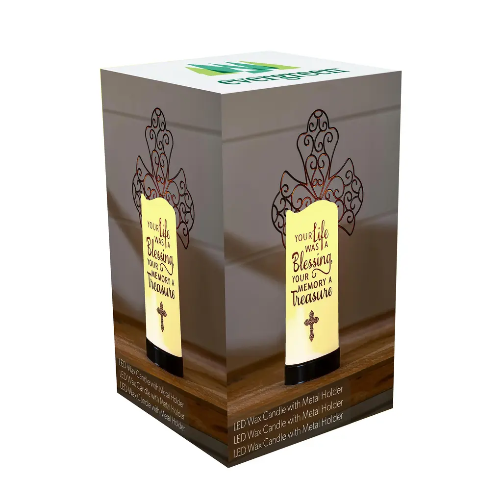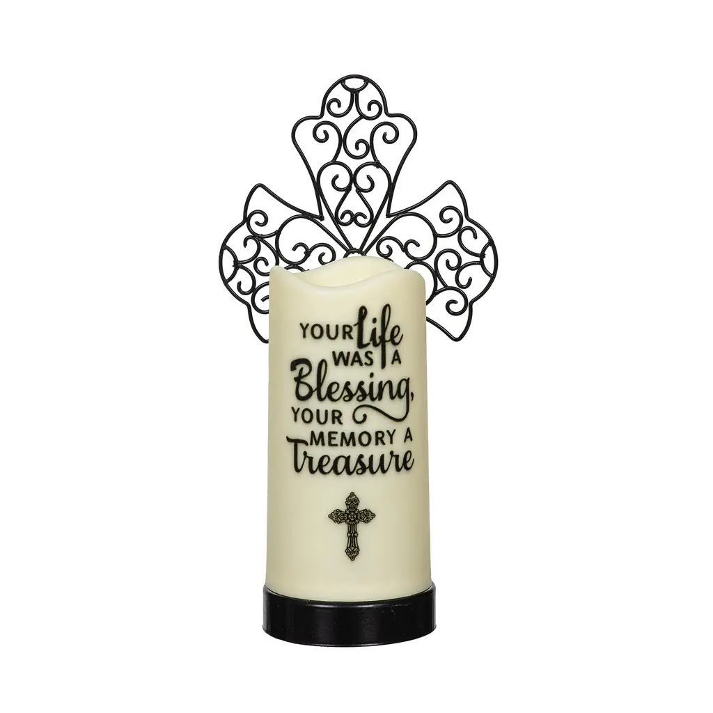 Illuminate any space with this charming LED candle that radiates warmth and serenity. Honoring loved ones that have passed, this candle is a perfect reminder when set on a table, counter, or desk. Crafted with attention to detail, it will help bring a sense of peace and comfort to the home. Whether unwinding from a long day or remembering loved ones, it is the perfect complement to any moment. It requires 3 AAA batteries, not included.