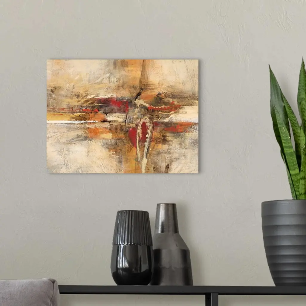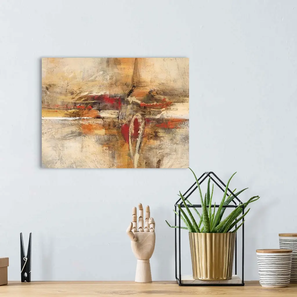 Contemporary abstract art print with a heavy texture effect in coppery shades of orange and red.