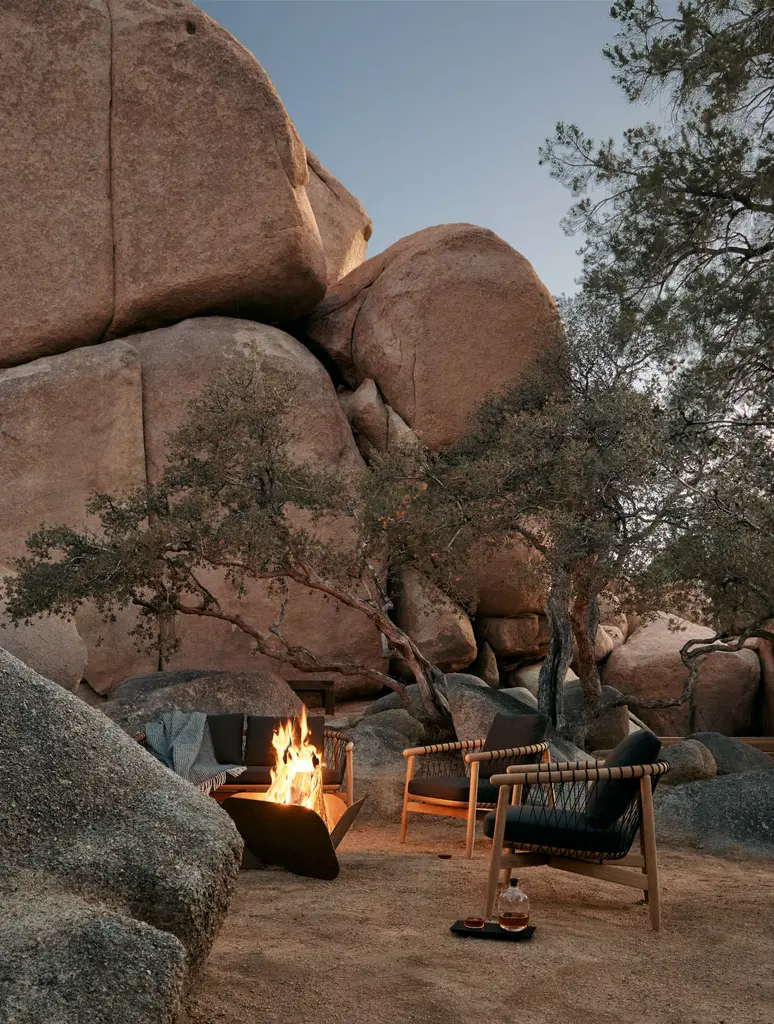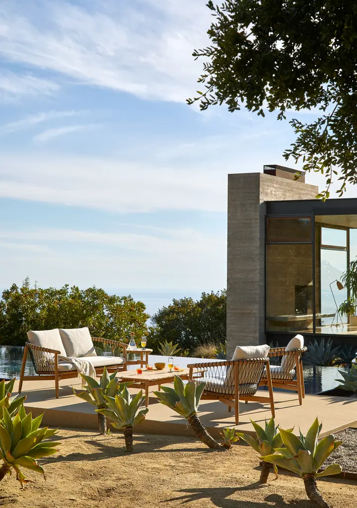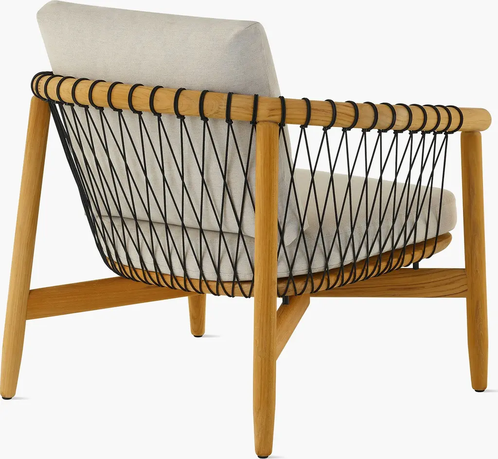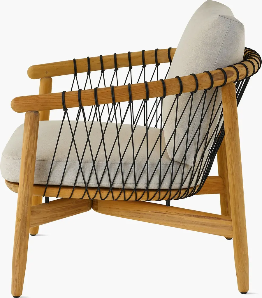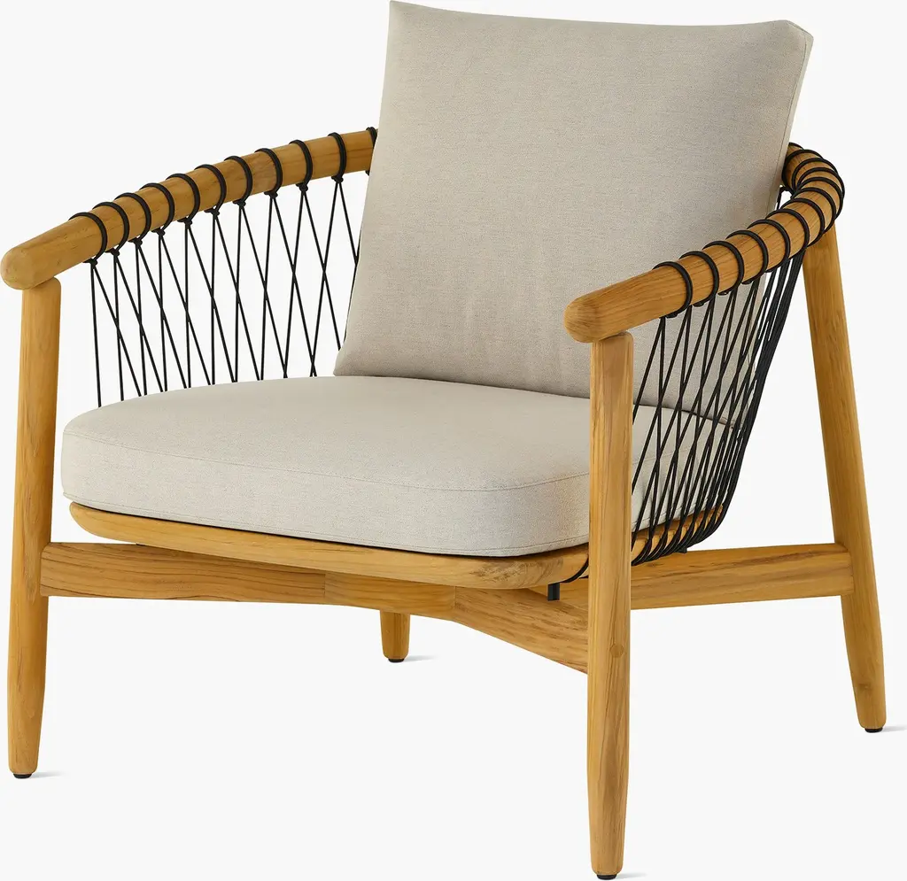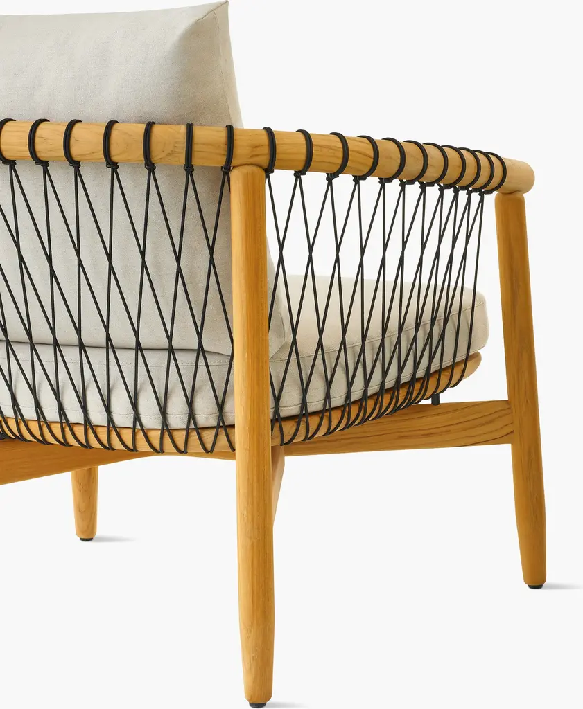 The popular Crosshatch Collection is now available in teak for outdoor relaxation and enjoyment. Designed by the Austrian firm Eoos, Crosshatch began with a desire to use an industrial material in a handcrafted way, resulting in a lattice that's both structural and decorative. After a year of testing ropes, they found the ideal choice to be parachute cord, which stays taut and won't stretch over time. This outdoor collection features gracefully curved, solid teak frames and cushions in weather-resistant Sunbrella Heritage fabric, which has an elegant linen-like hand.