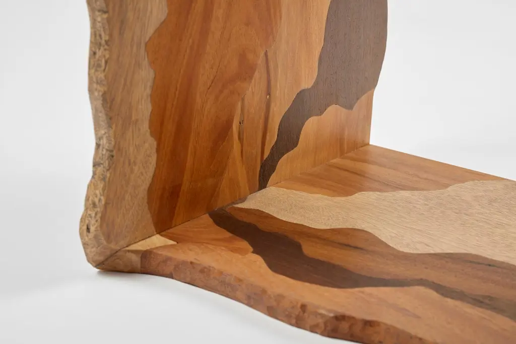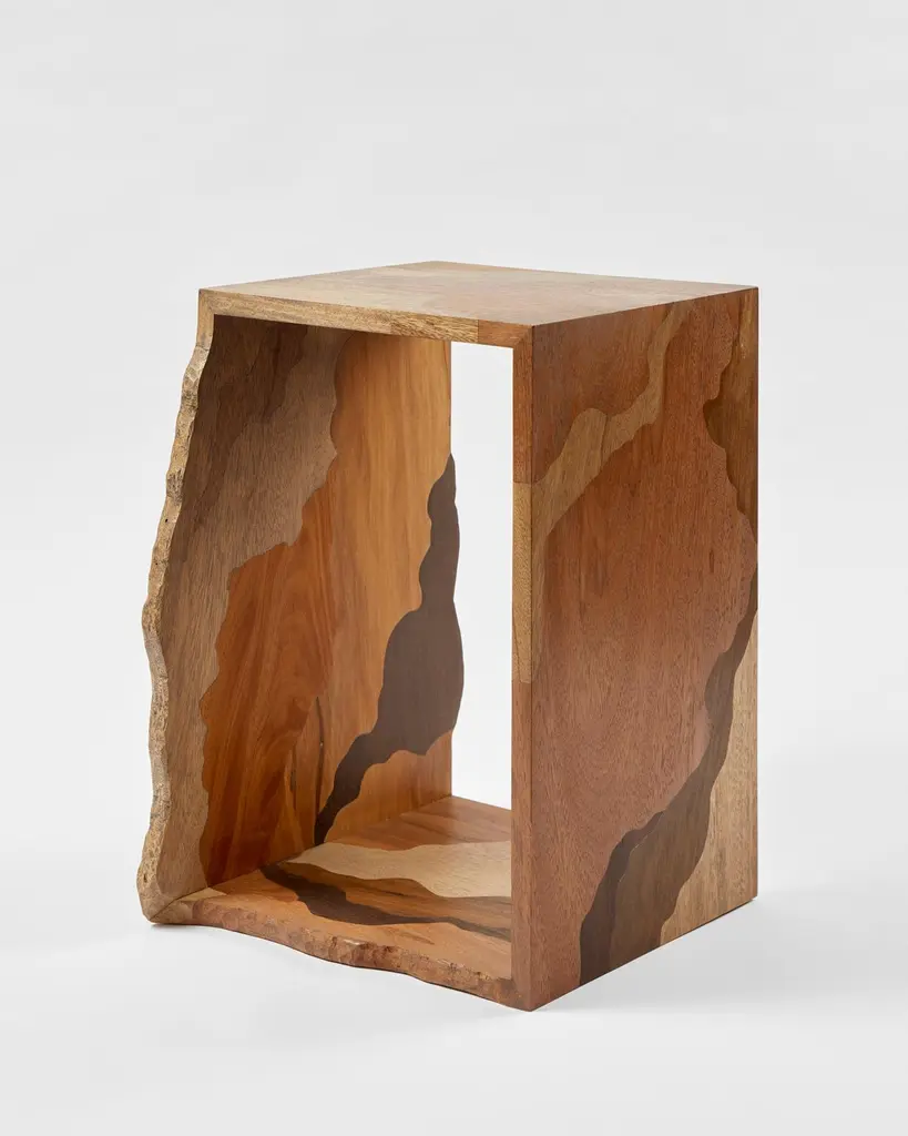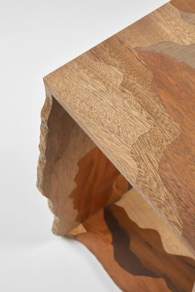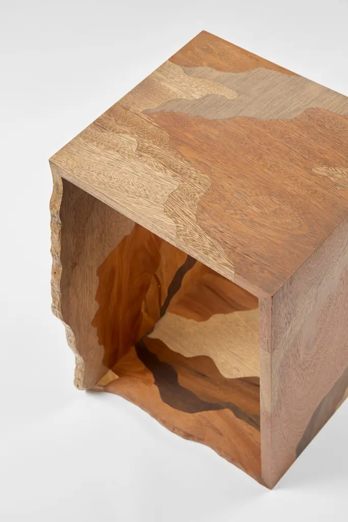 Crust N°2 by RF StudioDimensions: W 34 x D 34 x H 49 cmMaterials: Diverse recycled amazon timberCrust is part of the concept of skin that covers mineral and vegetable organisms and the search for physical contact that we establish with them. The pieces were developed based on the exploration of the diversity of minerals and local forests, with the intention of regaining contact with the specific materiality that makes up our territory. From small fragments of local stones and woods collected – material considered mostly as waste by the industry – an assembly technique was developed to create these pieces.ESTUDIO RF is located in Lima, Peru. We are dedicated to the research of the contemporary habitat and natural environments in the Peruvian context, seeking to dissolve established limits between them. Our multidisciplinary team is conformed by visual artists, architects, traditional artisans, performers, designers, actors and writers. We regard art as an open field that functions like a hub that establishes new relationships between nature and human activity.We aim to rebuild the continuity between natural landscape, art and architecture by reconnecting the current urban condition with the bodily experience of being free in the wilderness. We acknowledge fluidity and non-definition of the landscape; a wild and dynamic setting were everything coexists without visible hierarchy or law.In opposition, the urban landscape is defined by social codification, segregation and segmentation of space. The values of the global market and technological modernity are creating distance and alienation in everyday life.Faced with this, we return to the heterogeneous, through natural ecosystems, to raw materials, to organic processes and to traditional local craft; we bring to light its real value, and reestablish contact between these elements and the body.We consider the human being and society not as nucleus, but as part of an ecosystem; a big community of living organisms. In a society governed by images, noise, artificial light and industrial materials, we find solace and intimacy in the darkness of the wild environment that meet us through the opaque and warm qualities of the natural shadows surrounding us.We create a balance between visible and palpable, between sound and silence, between industrial or digital production and natural or artisanal materials. Our goal, beyond ideologies or artistic intent and manifestos, is to reimagine the intimate acts of daily life as a potential means for future transformation.