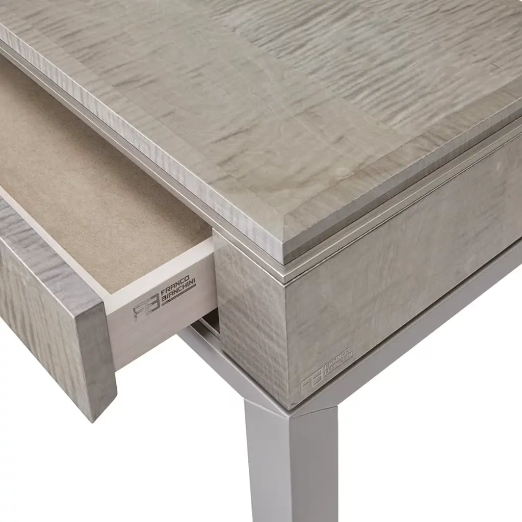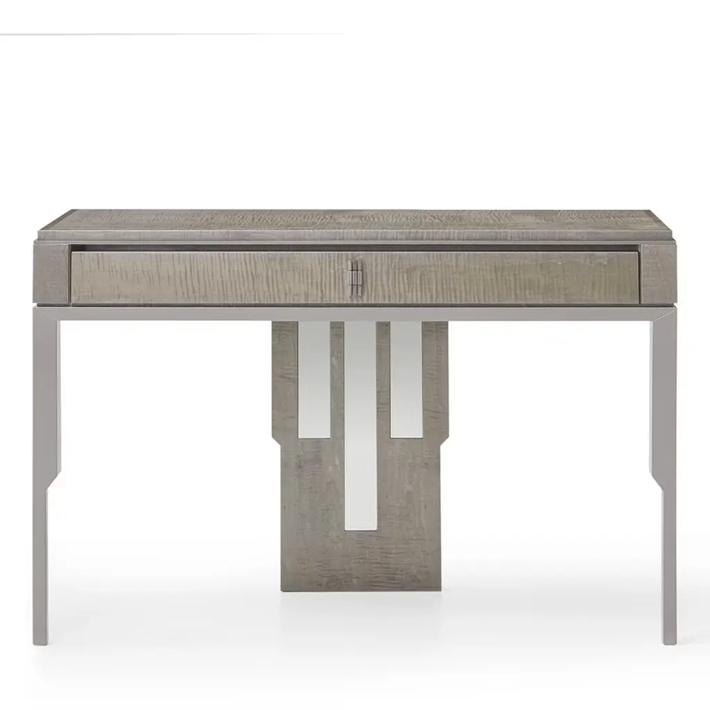 Fashioned of prized fiddleback sycamore enhanced by a glossy transparent finish, this console is sure to capture the eye with its rigorously sculpted silhouette rich in geometric influences. Nickel-finished metal profiles combine with mirrored-glass inserts for the central back leg, which adds to the front legs lacquered in glossy gray. Equipped with a push-pull-opening drawer innerly fashioned of natural wood, the piece requires no assembly.