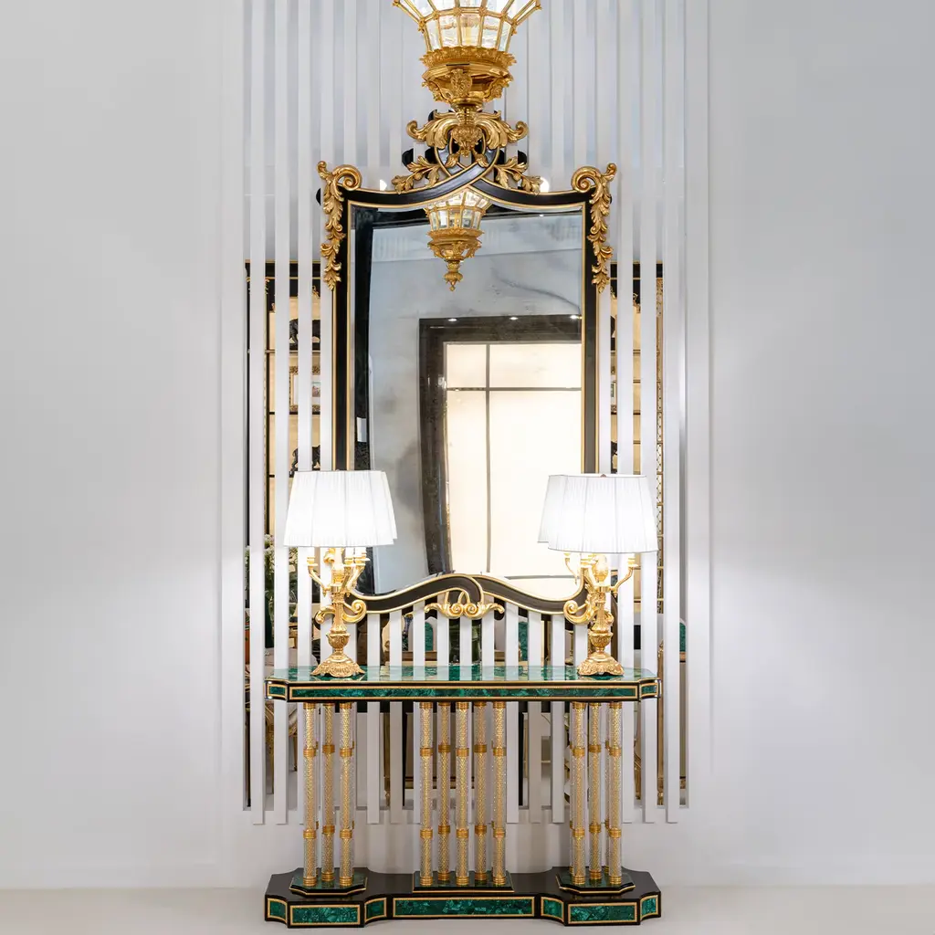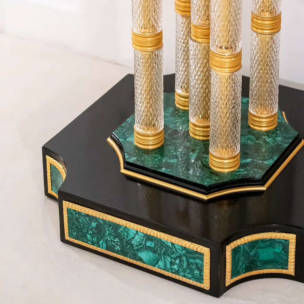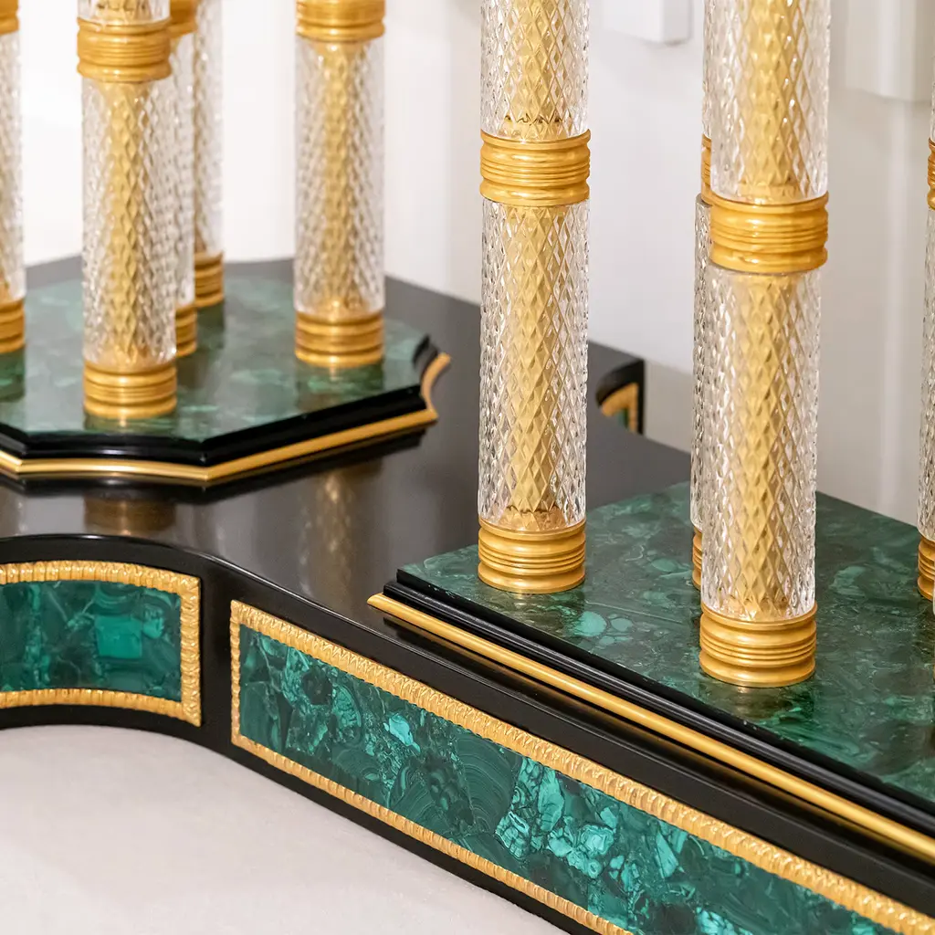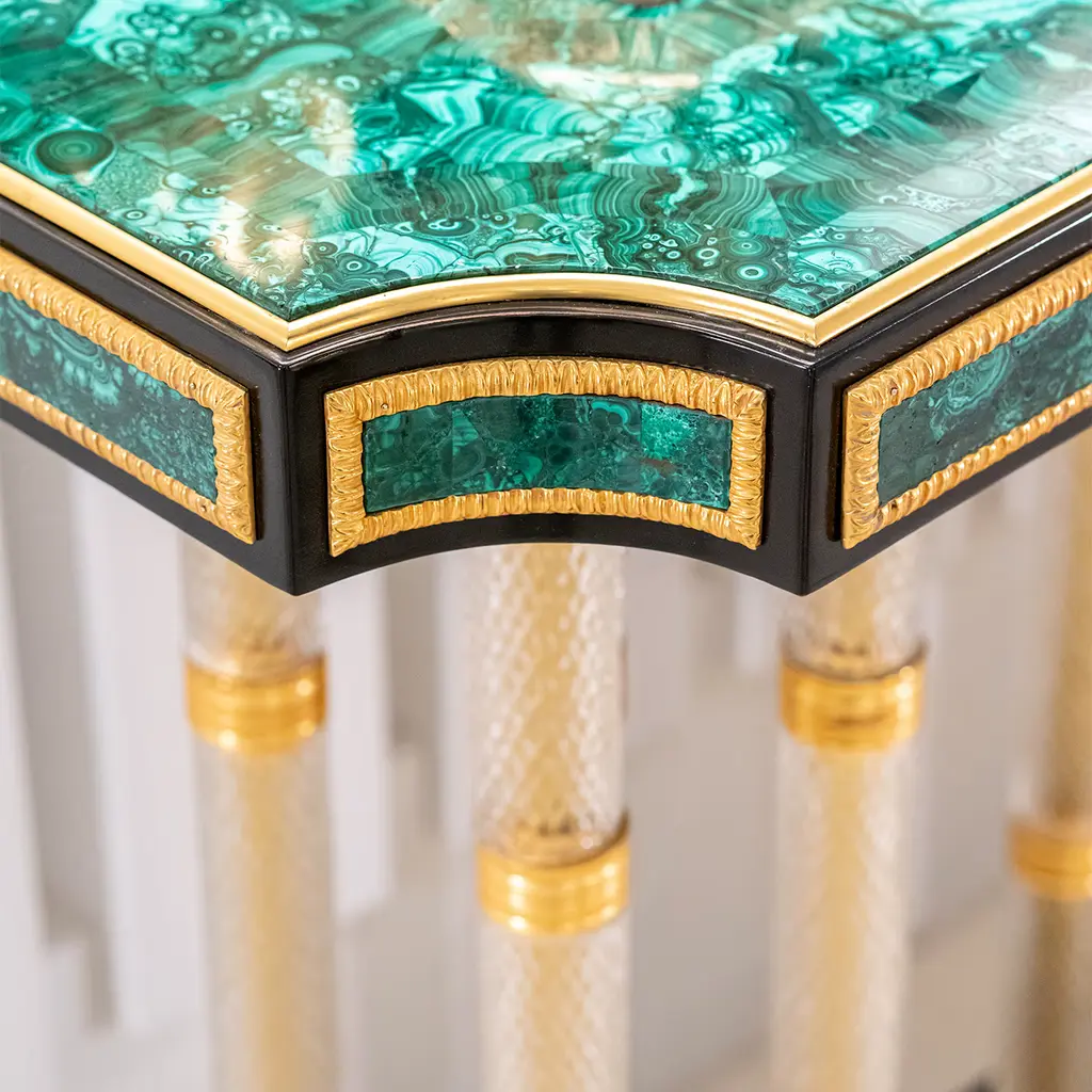 An exercise in unrestrained grandeur, this lavish console is an undeniable statement piece for luxurious homes. The striking top and base are fashioned of black-lacquered wood coated with green Malachite (bookmatch design) with gold trim, echoed in the three sets of legs supporting the piece (15 total) covered in hand-blown and diamond tip-worked crystal. Details in 24kt gold plated bronze seal this console's sophistication. Please contact the Concierge for possible customization options.