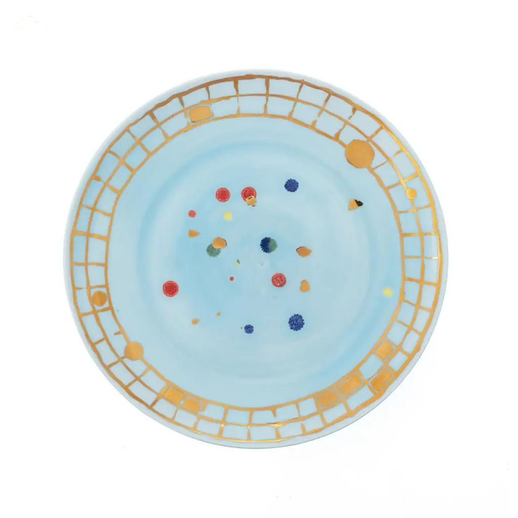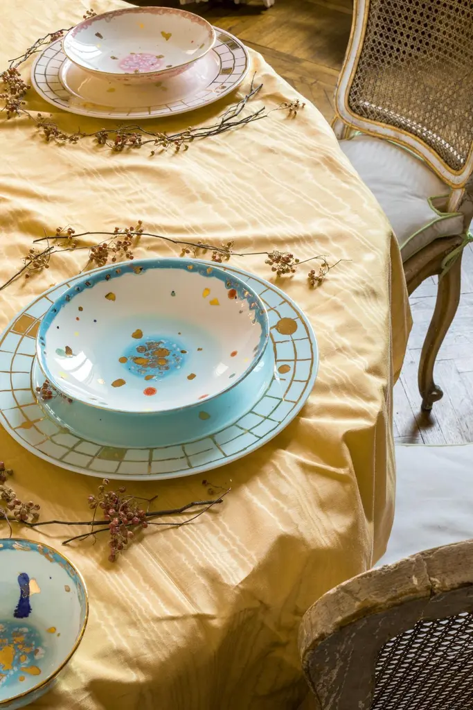 Luxurious and cheerful, the Florida collection was launched in 2023. It is inspired by the American state famous for its strong character and colorful heritage. Each line is characterized by a color. They are inspired by some of the most famous places in Florida, recalling its beaches and its sunsets, stretching between the Gulf of Mexico and the Atlantic Ocean.Palm Beach pink, Miami orange, Amelia green, Naples yellow, Crystal tourqoise, Islamorada lavender.Each plate is decorated with a lightly colored center interspersed with multicolor dots. The rim is richly decorated golden leafs. The charger, tea and coffee cups have are decorated with a golden net- The dessert plates and teapots have a distinct design characterized by golden rays crisscrossing their surface.