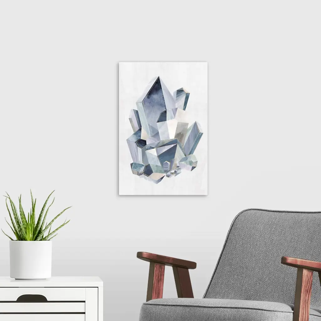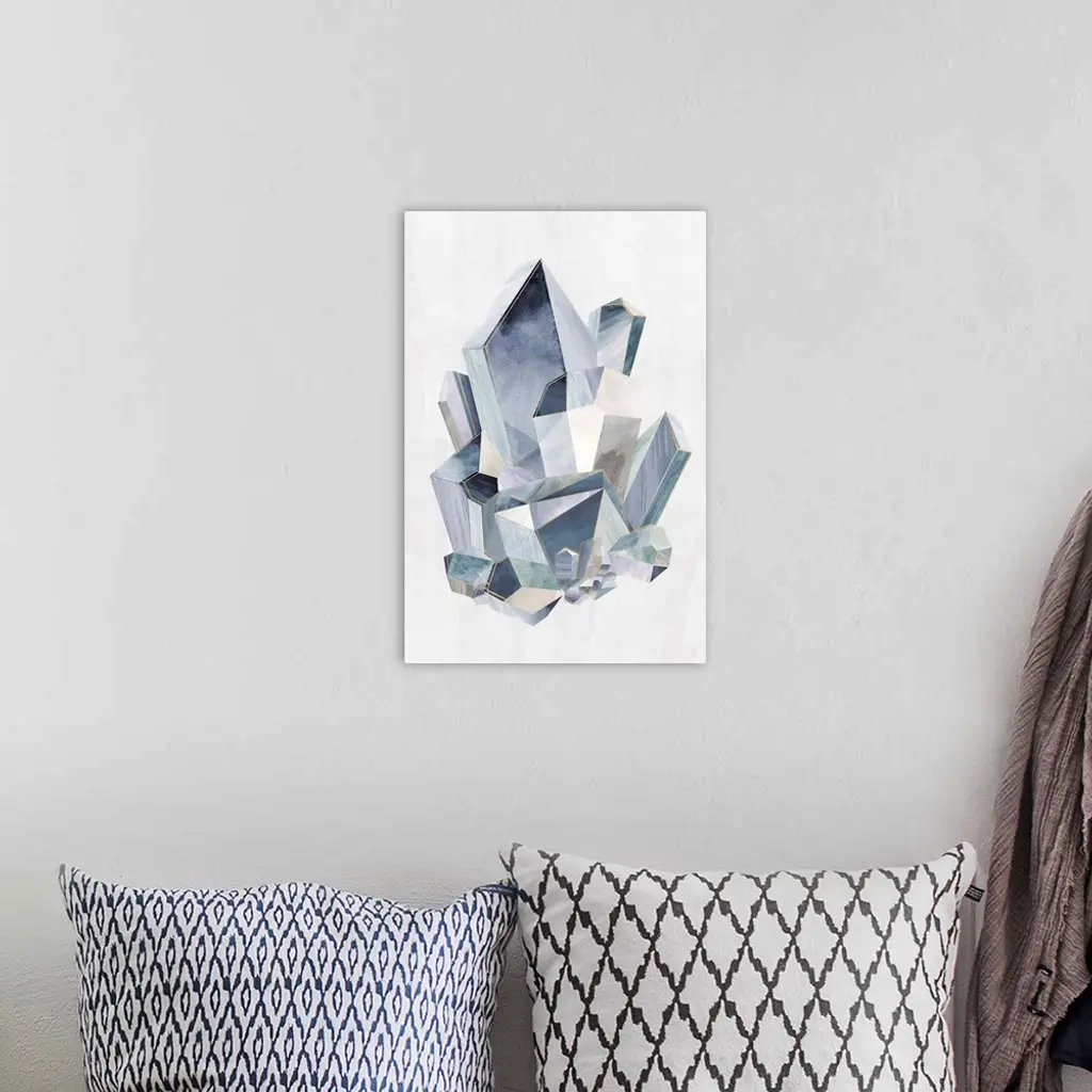 Decorative wall art with rock crystal shapes compacted together in shades of blue with gray and white tones and metallic gold highlights.
