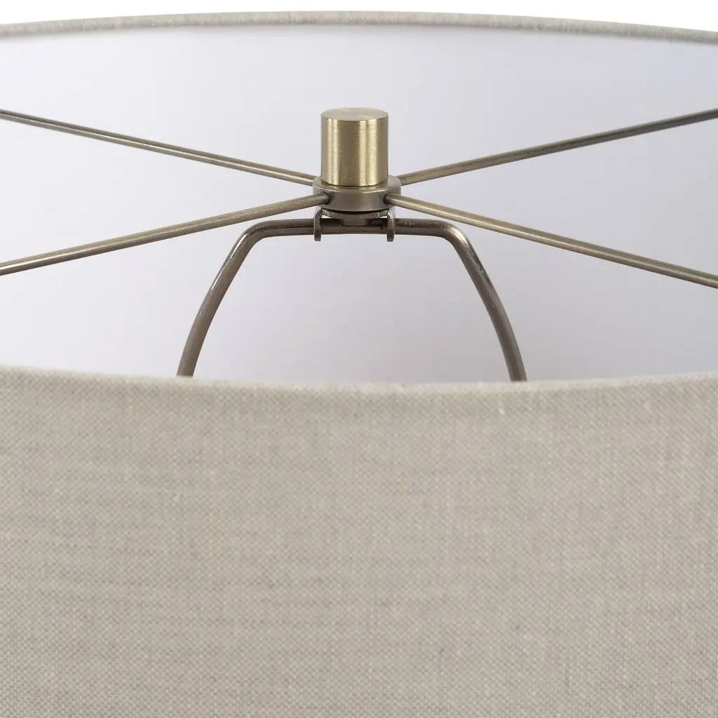 Elevate your décor with this elegant table lamp, showcasing a dark bronze base paired with a stunning Travertine stone ornament for a modern yet timeless appeal. Topped with a round hardback shade featuring natural slubbing, it adds texture and warmth to any room. Perfect for enhancing living spaces or bedrooms, this lamp effortlessly blends sophistication and contemporary style, making it a captivating focal point in your home. Product Features: Table lamp with white shade Linen wrapped base paired with crystal detail Round hardback drum shade Base: E26 Lamp uses (1) A-type 150 watt bulbs (not included) Switch type: 3-way UL listed for indoor use Dimensions: Overall dimension: 29" high Shade dimension: 11" high x 18" diameter Material(s): metal/crystal/linen fabric