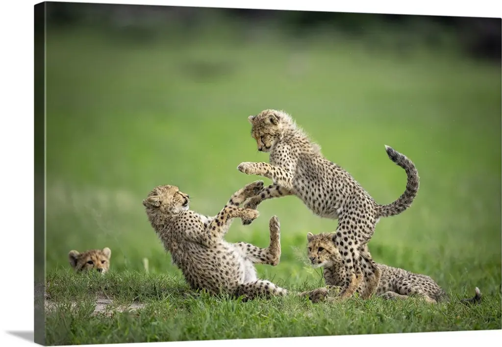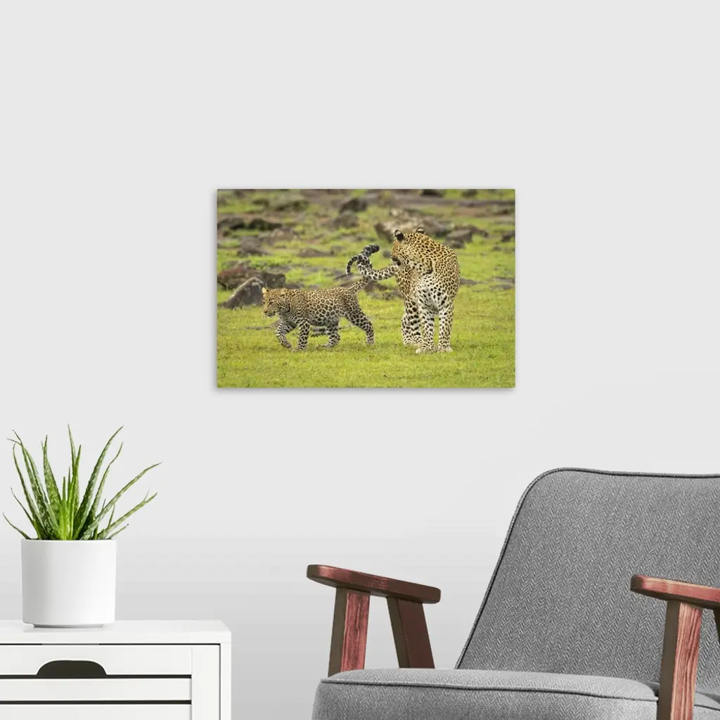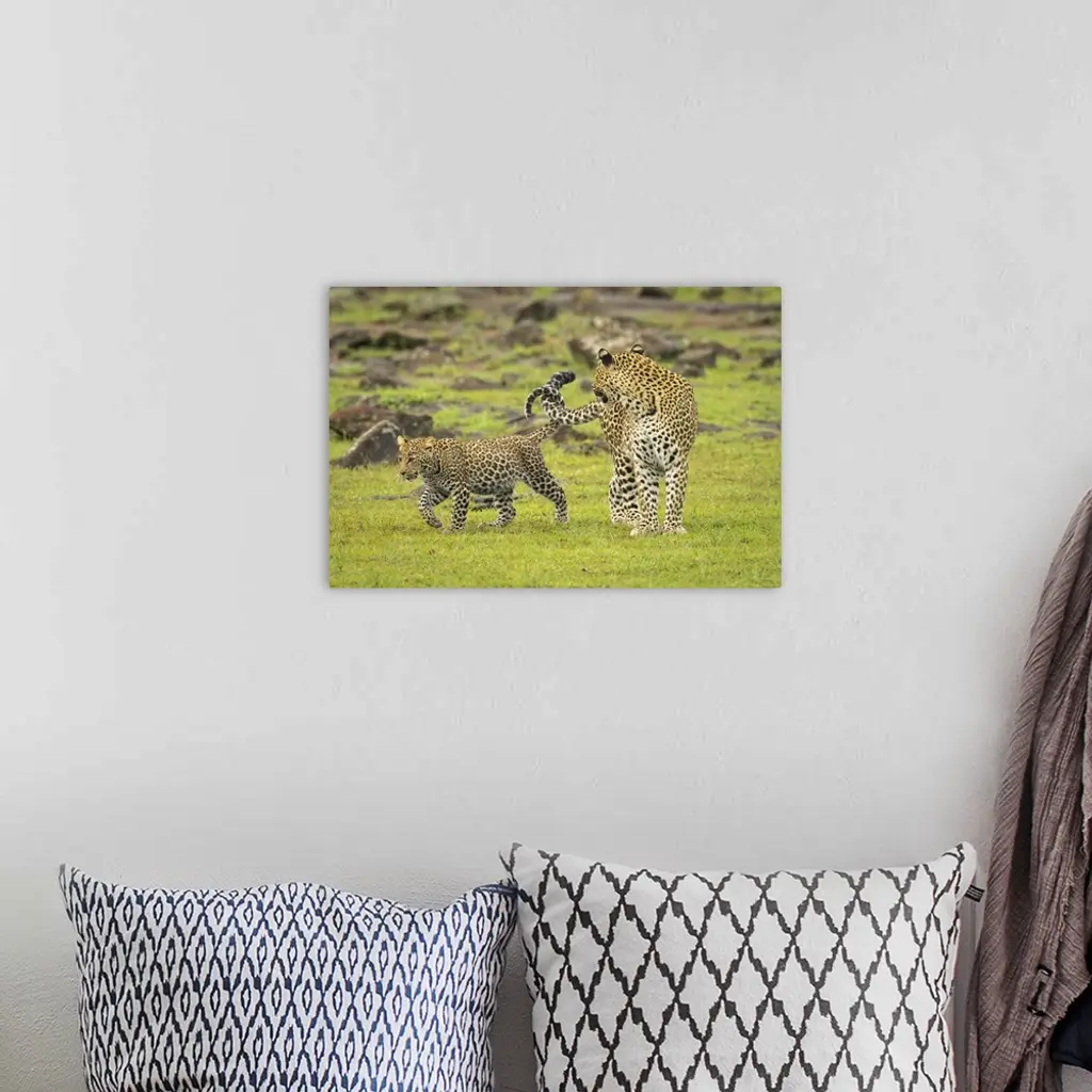 Cub Passes Leopard Near Rocks Linking Tails In Maasai Mara National Reserve, Kenya